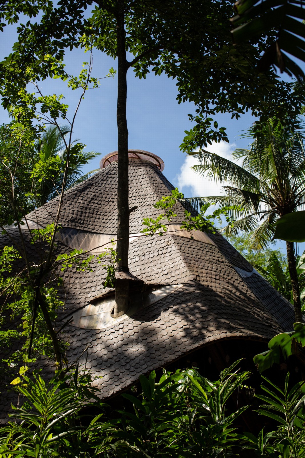 为了保护环境,设计巧妙地保留了现场现有的树木。此外,地基使用了河石,营造出建筑自然融入周围环境的感觉。施工过程涉及与当地工匠的合作,村民们手工制作了构成建筑引人注目的弯曲屋顶的铜片。由透明丙烯酸制成的天窗点缀在屋顶上,让光线穿透下面的空间,有助于建筑与周围自然环境的和谐融合。该项目结合了多种材料——石灰、烧粘土、金巴兰、水泥瓦和陶土瓦——以创造出引人注目的视觉效果。