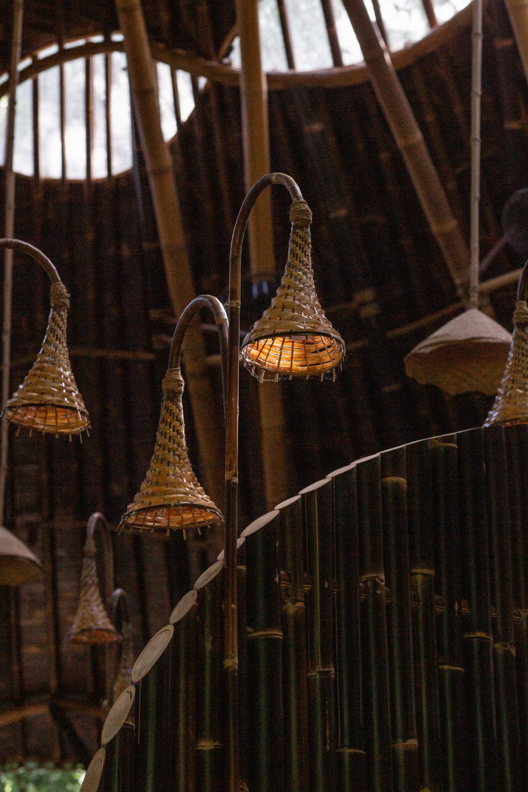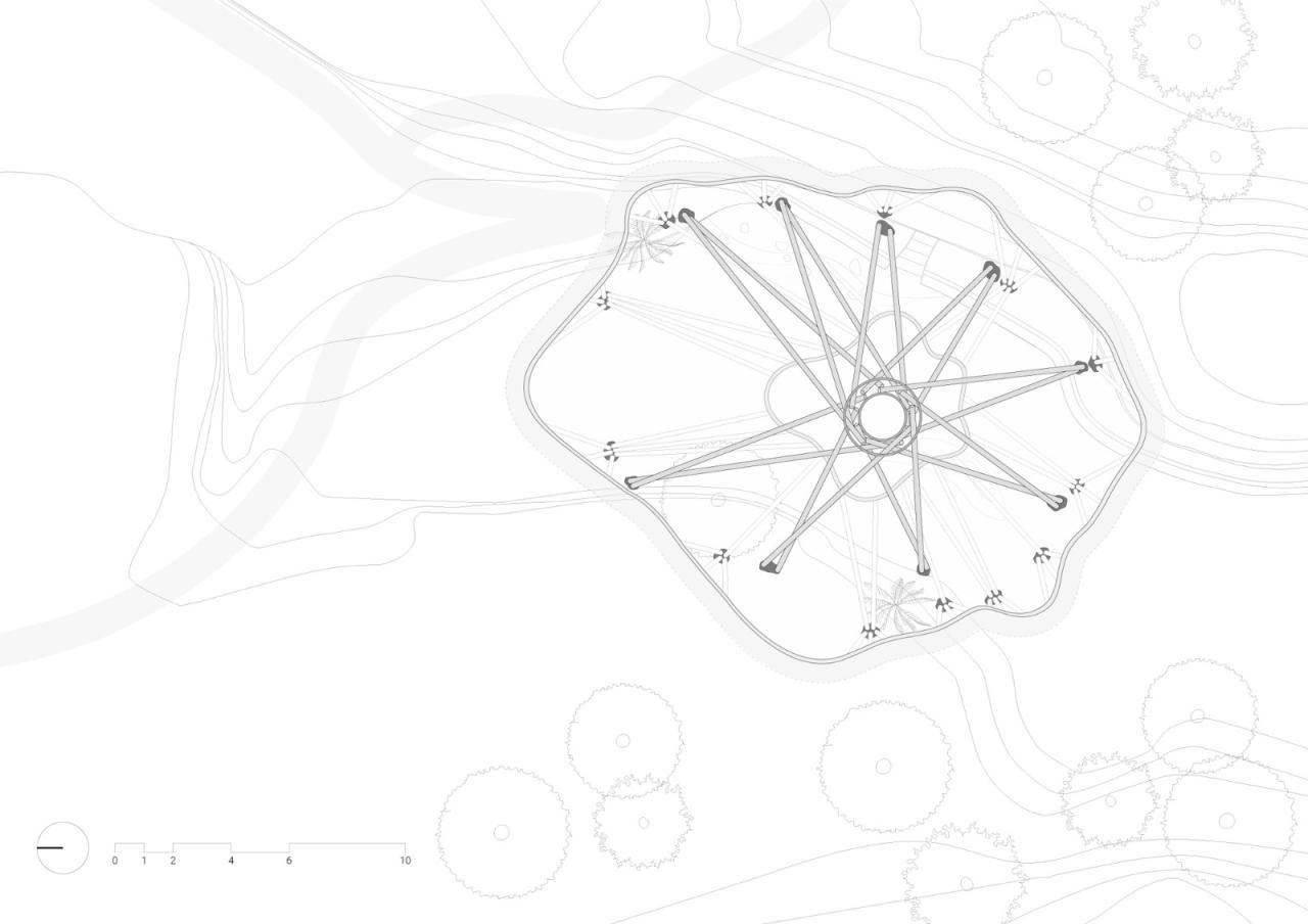 建筑的屋顶由扇形柱和利迪捆(结构竹梁)支撑,以确保稳定性并保持流畅的曲线。一座中央的互反式塔楼——具有狭窄的颈部和宽阔的基座——支撑着建筑。塔楼本身横跨不同的楼层,与场地的自然轮廓对齐。这些独特的结构元素首先在1:1的比例下进行了原型制作,以测试其性能并解决工程挑战,然后才进行大规模施工。