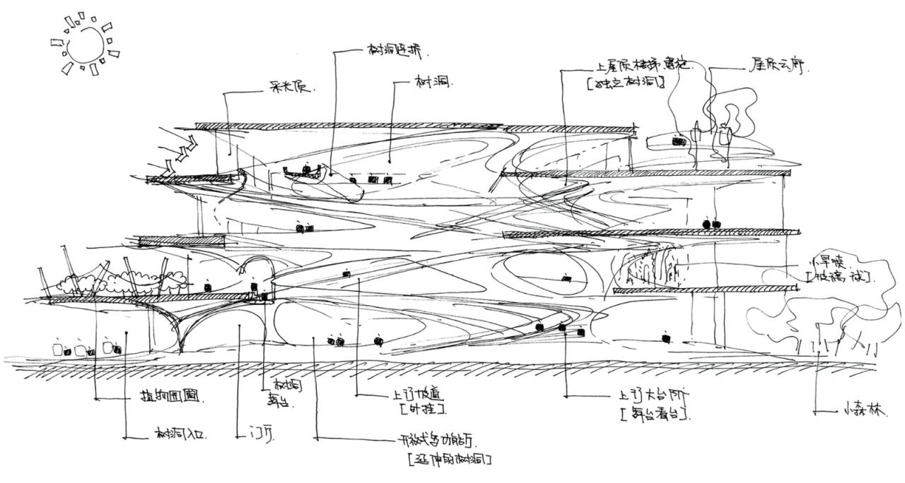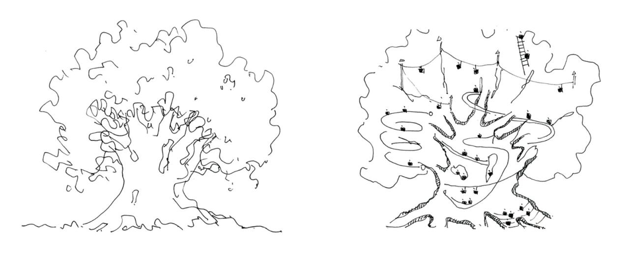 设计从一棵树开始。我们希望创造一个童话里的大树空间,孩子们上上下下的攀爬、对望,排排坐在大台阶交谈,或是去发现一个个树洞所看到的不同的世界。树洞是最原始的空间形式之一,也是孩子对空间最纯真的感知,希望这里成为孩子们梦想开始的地方。