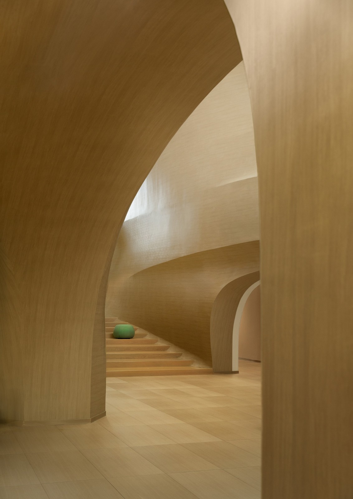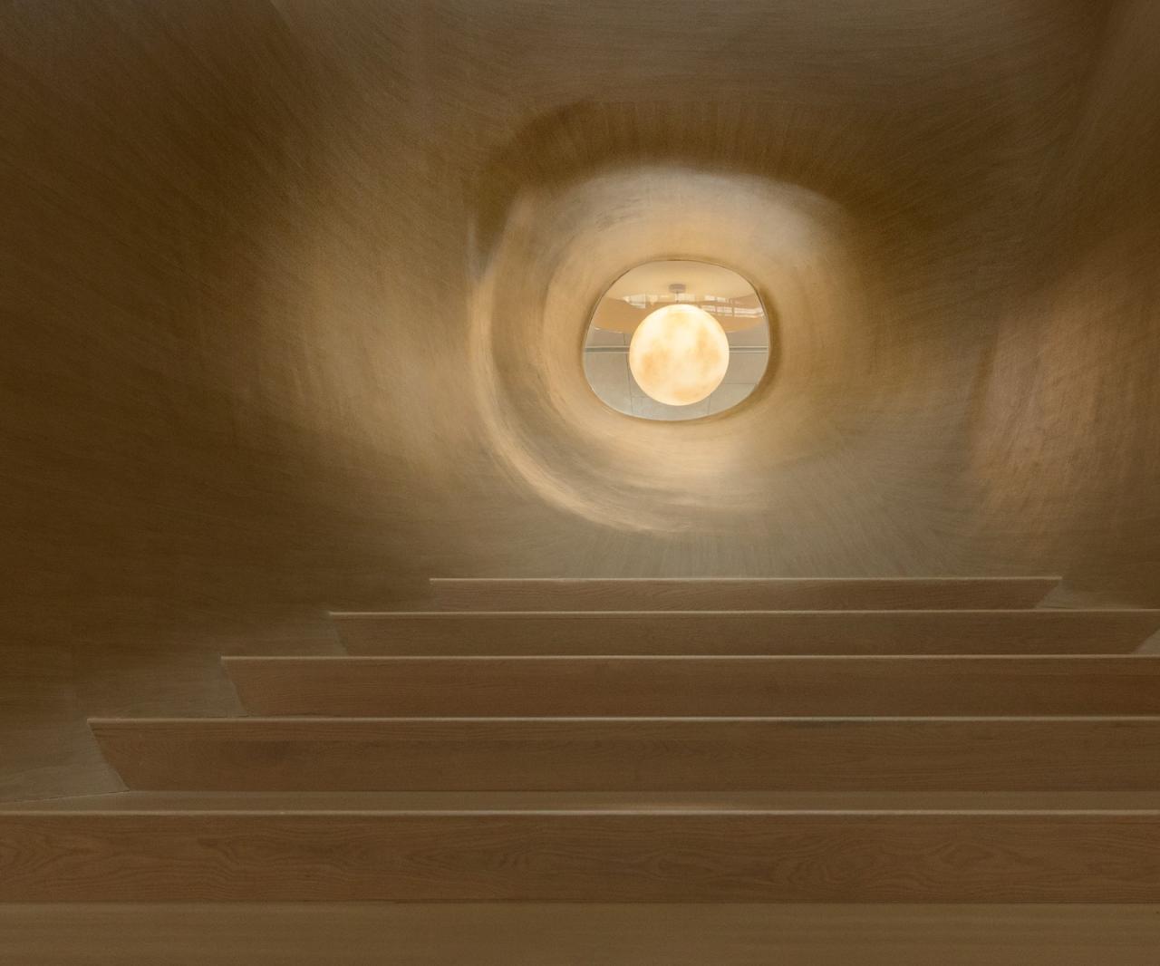 阳光充盈的中庭,曲面将孩子环抱,既是空间的中心也是探索的起点。中庭流畅的的曲面形态和肌理,让孩子们宛如置身河谷中央。亲和温暖的木纹肌理,让每个孩子随性触摸。不同大小形状的洞口,是发现好玩之事的前哨。连接中庭和各个功能房间的走廊,互相对望的楼梯窗口,为孩子创造更多的活动惊喜,是空间中的缓冲和联系层,也作为“大树”这个意向中“枝杈”的存在。