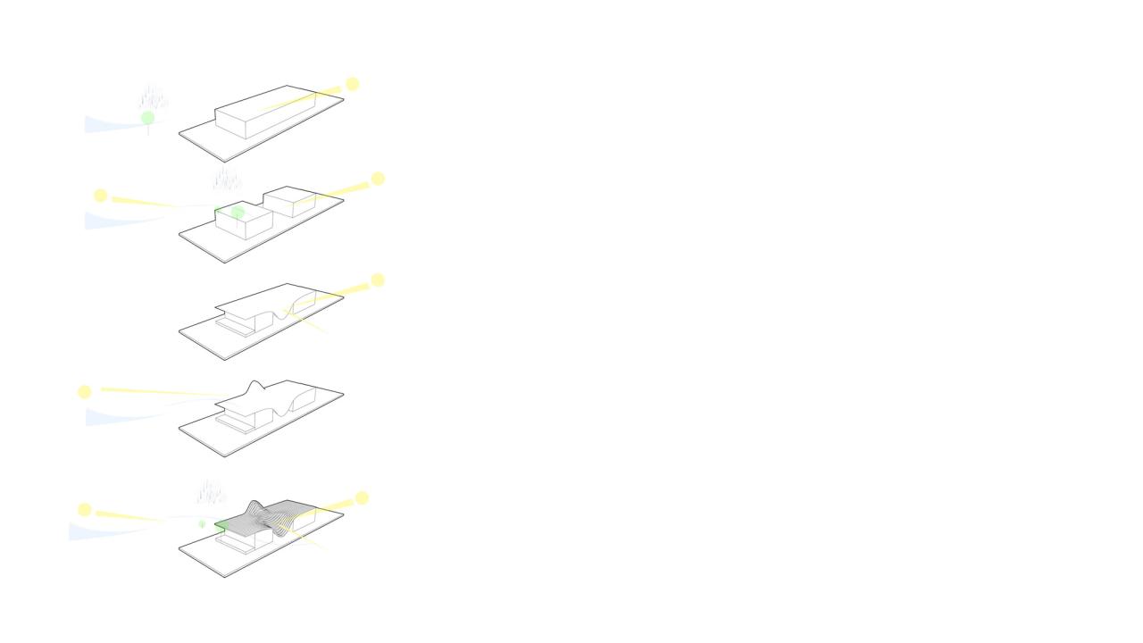 在东侧,这道曲线延伸到屋顶,形成了一个可以沐浴阳光的开放空间。曲线上的穿孔让阳光在地面上投射出图案,并将雨水洒入院中。庭院中的河石是记忆之物,让人想起附近流淌的河流。这道曲线不仅仅是一个雕塑元素,更是一面可供攀爬至屋顶、躺下仰望云朵飘过的游乐墙。曲线连接了地面与屋顶,创造了一个三维的休闲区域。