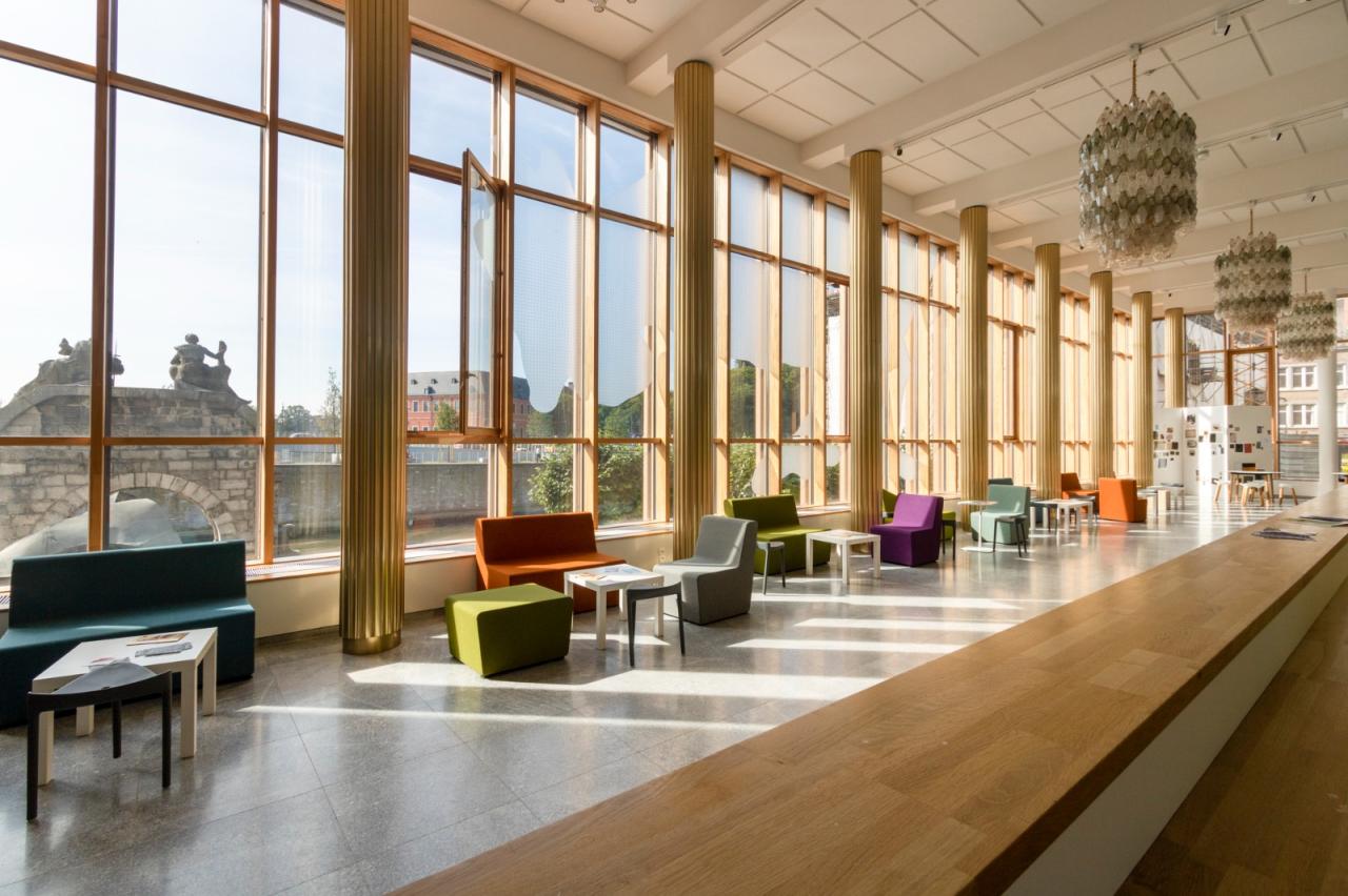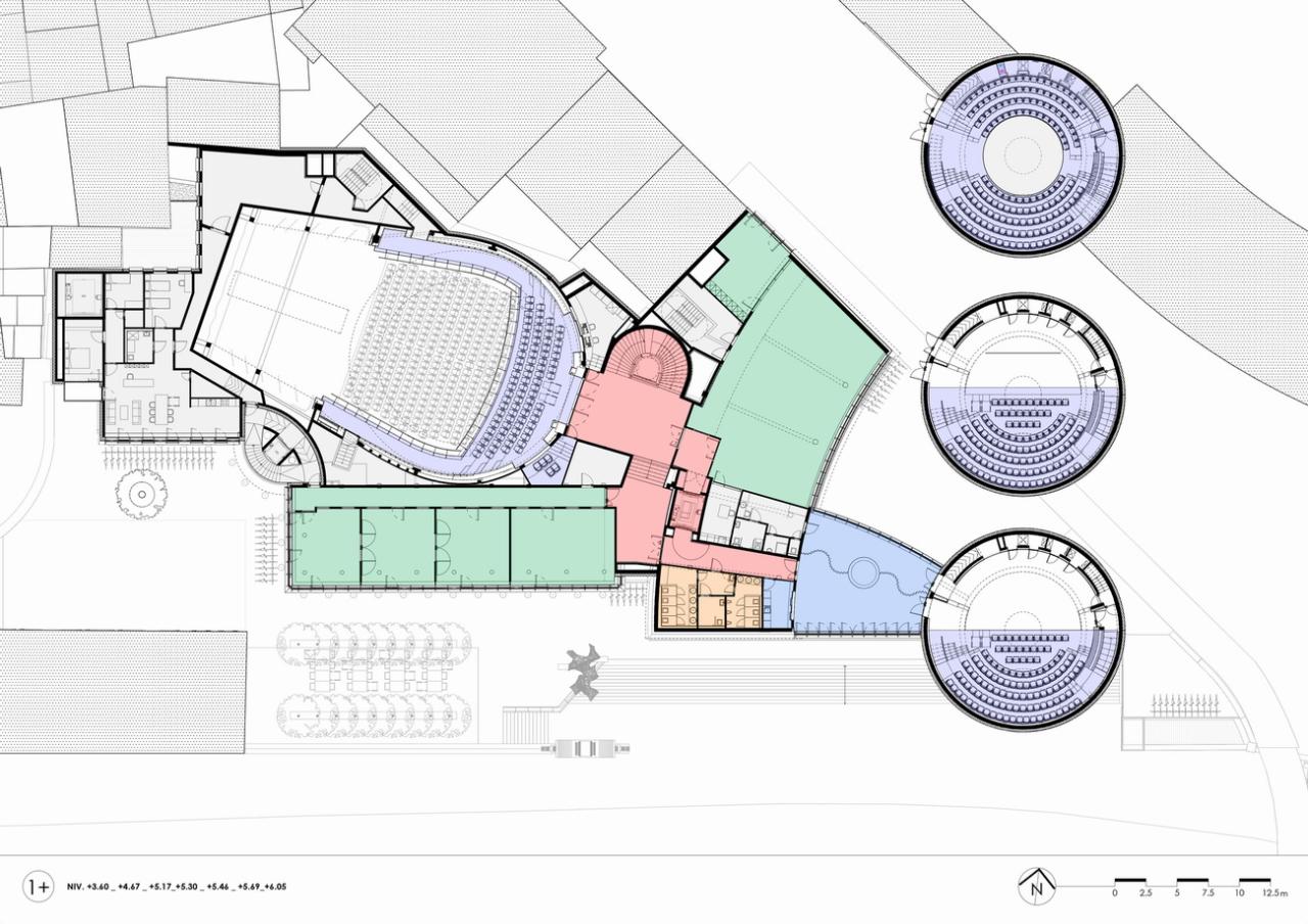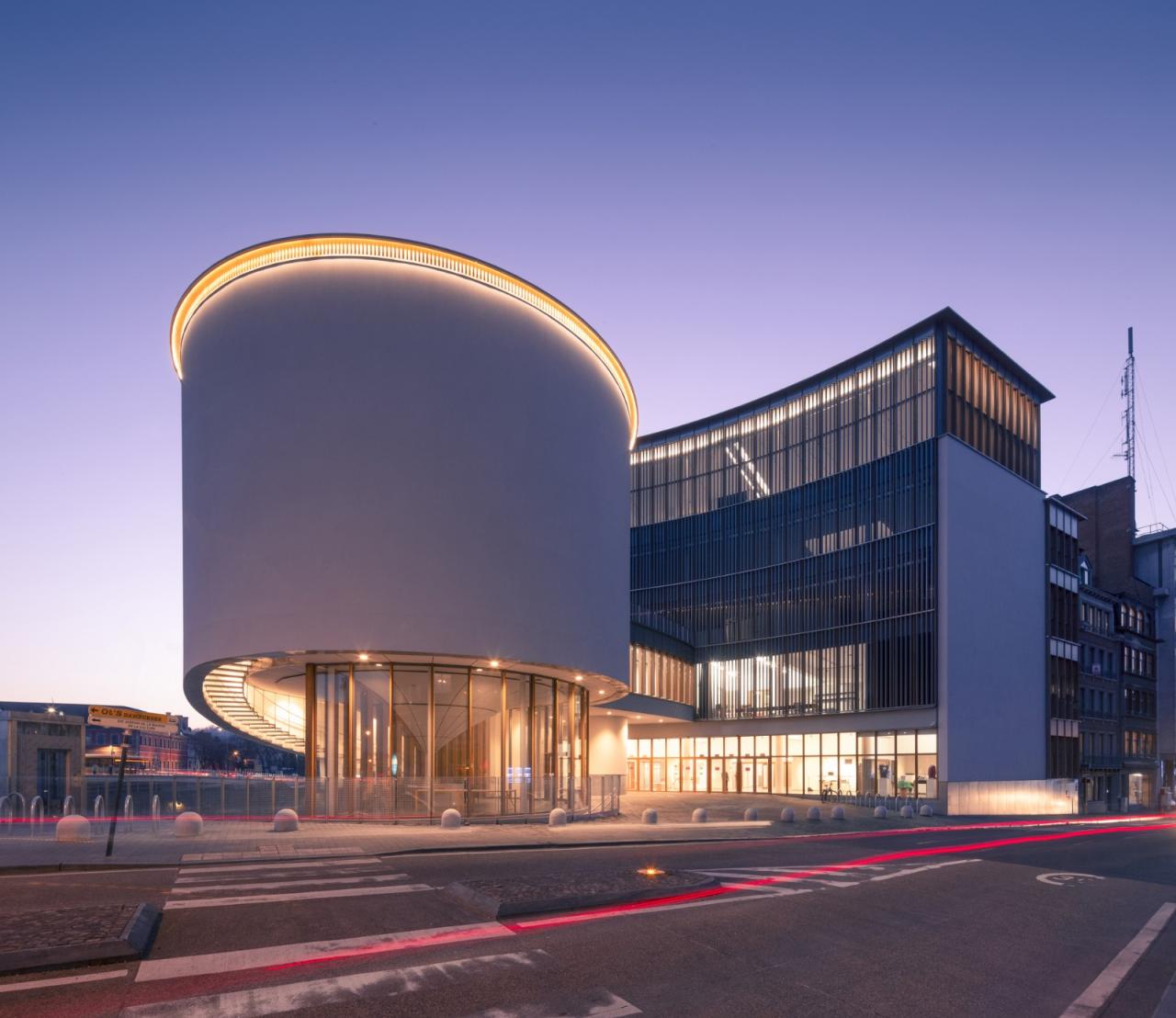 该文化中心位于那慕尔市中心,坐落在桑布尔河的北岸,面对着被称为“Le Grognon”的历史市中心。该建筑由维克多·布尔乔亚设计,并于20世纪60年代初建成,经过翻新和扩建,以满足当地居民的当前需求,并适应布歇街和桑布尔河岸的重建。原建筑由一个可容纳400人的剧院组成,位于一个四层的矩形盒状空间的一端,南侧有一面幕墙(俯瞰桑布尔河),与一个五层的弯曲矩形盒状空间相连,称为“新月”,东侧设有幕墙,南端则为无窗墙面。