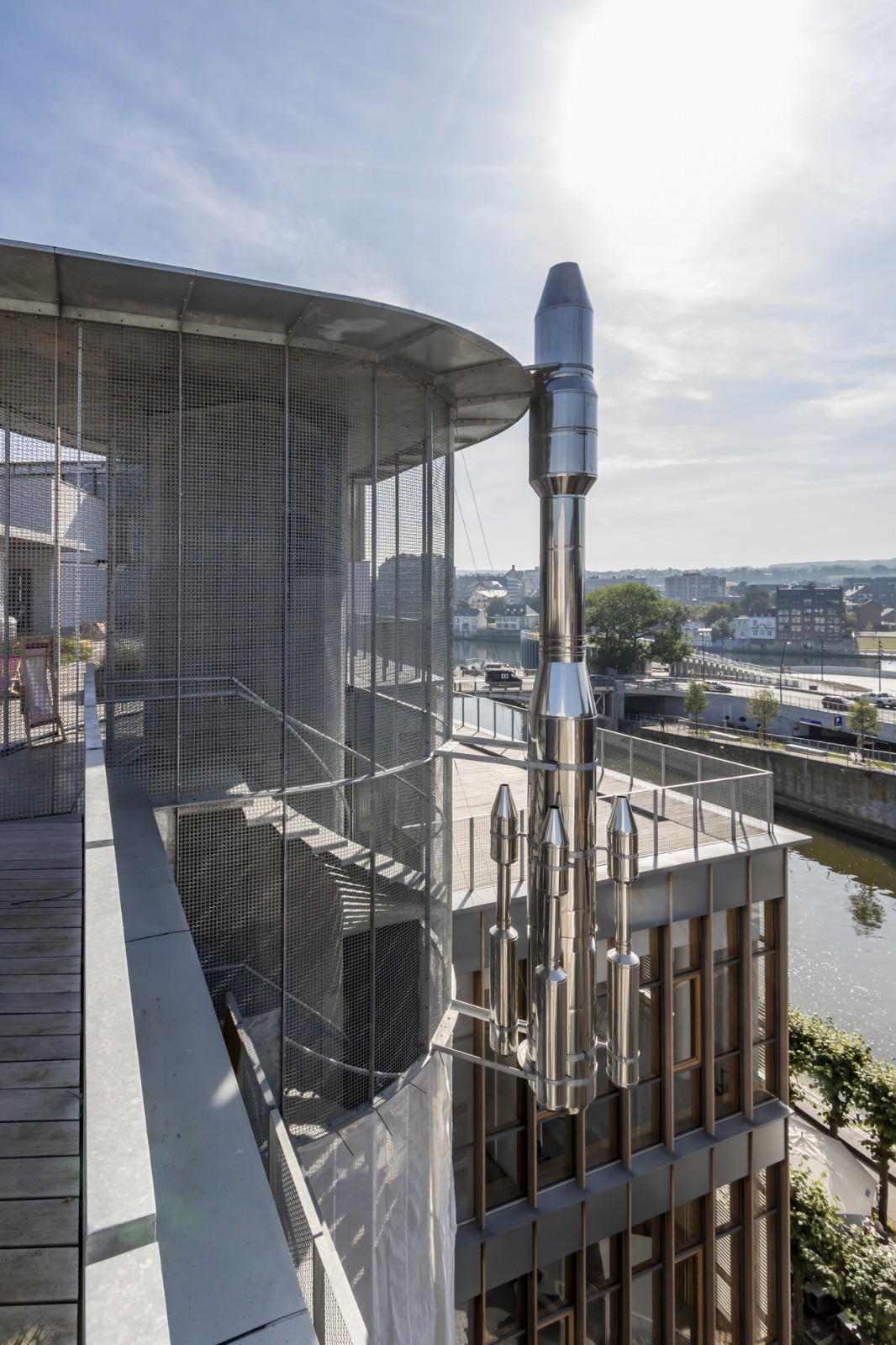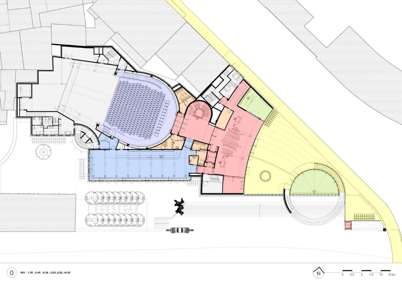 自然通风与声学 -尽管在理想的城市环境中依靠自然通风和采光完全可行,但城市内部的环境条件(如气味、噪音、灰尘、地面和墙壁污垢、过热及遮阴)逐渐且明显地恶化。建筑越来越多地被设计成保护它们免受这种恶劣环境影响的“盒子”,被封闭以抵御这些物理侵害,从而与周围环境隔绝。得益于地形和河流的优势,那慕尔市中心空气流通良好,较少受到这些不利因素的影响。因此,项目可以回归更合理的做法,开放建筑以融入其环境。450个座位的主剧院屋顶采光装置不仅满足烟气排放和自然采光需求,同时由于远离噪音源,还可结合开启窗户实现自然通风。