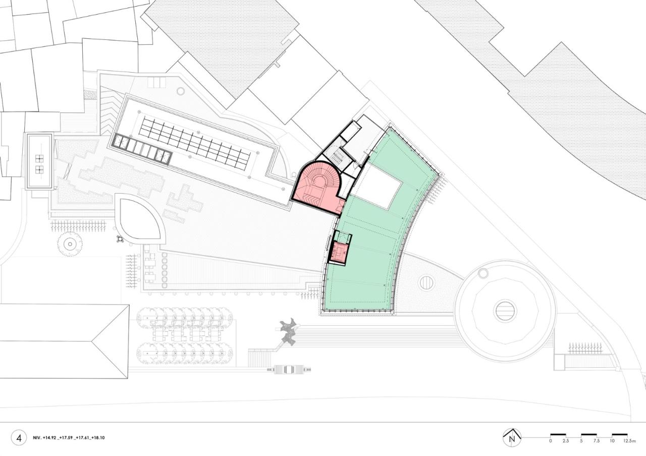 该项目保留了现有建筑结构(除了后台区域附属的小型建筑和场地西北角的建筑外)。在450个座位的主剧院的前厅内新增了一层中间夹层,并在“新月”顶部增加了一层(4层),并进行了扩建以满足必要的功能。这些新增部分将包括位于“新月”前东侧的“船头圆柱”,以及建筑东北部的大规模扩建。