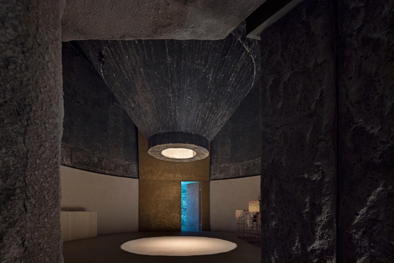 进入空间,首先映入眼帘的是一个倒锥形的混凝土形态,其表面呈现出深邃而粗犷的质感。设计团队巧妙利用这一混凝土形态来规划光线,使得整个高耸的空间因顶部光线的缺失而显得更加深邃莫测,弥漫着一股神秘的气息,仿佛它来自天外异域。