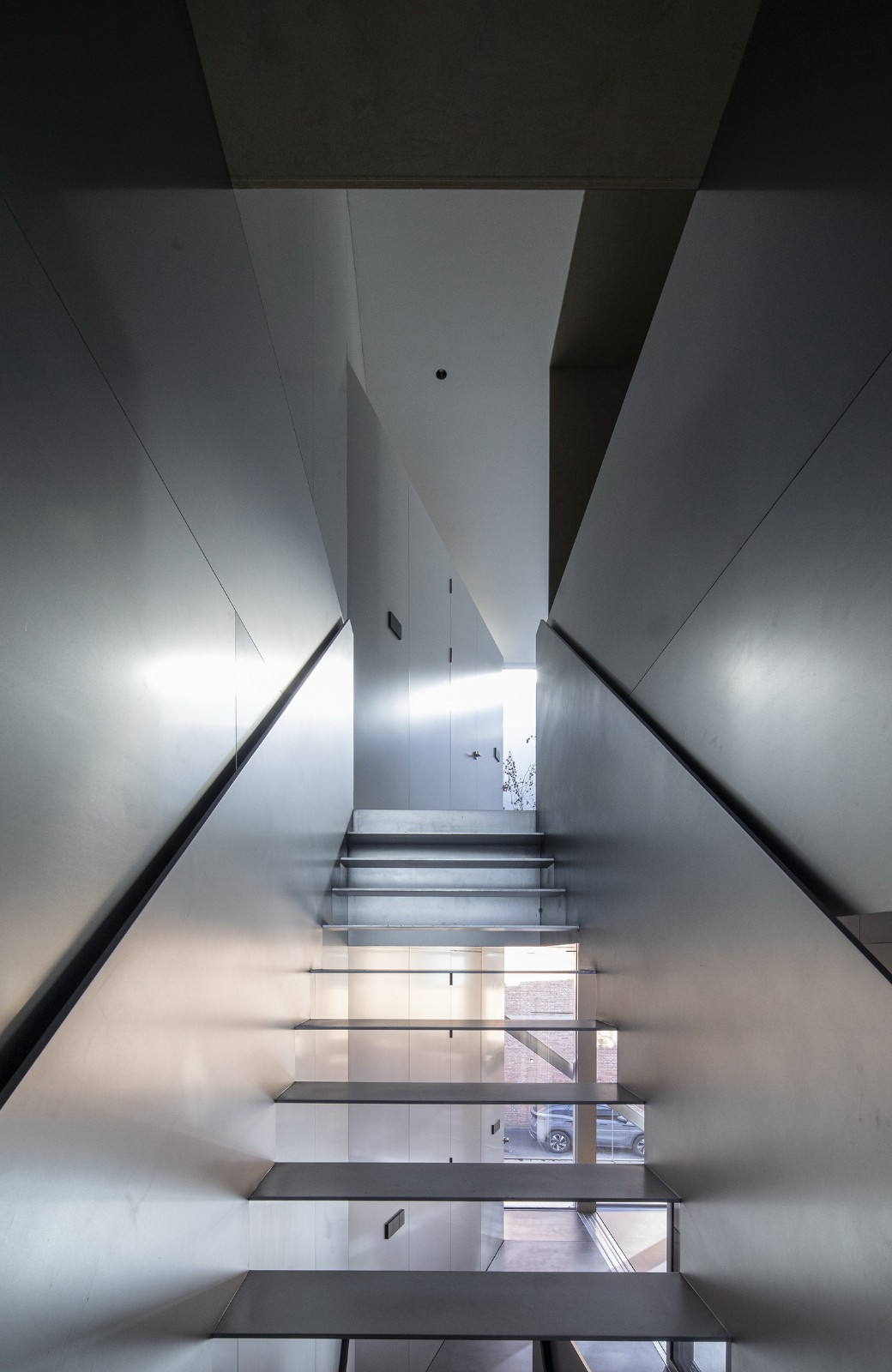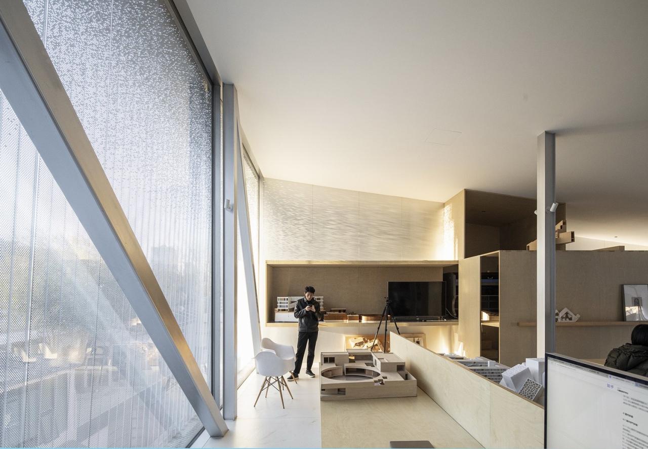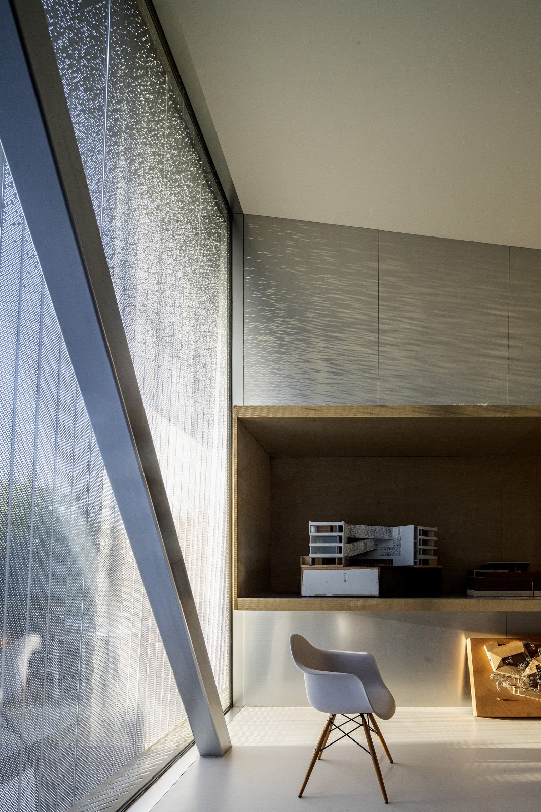随着楼层向上,空间逐级缩小,高度直至屋顶,向西的侧窗也随之从地面上升到屋顶,被外层冲孔铝板过滤的下午阳光可以柔和地洒满整个空间。