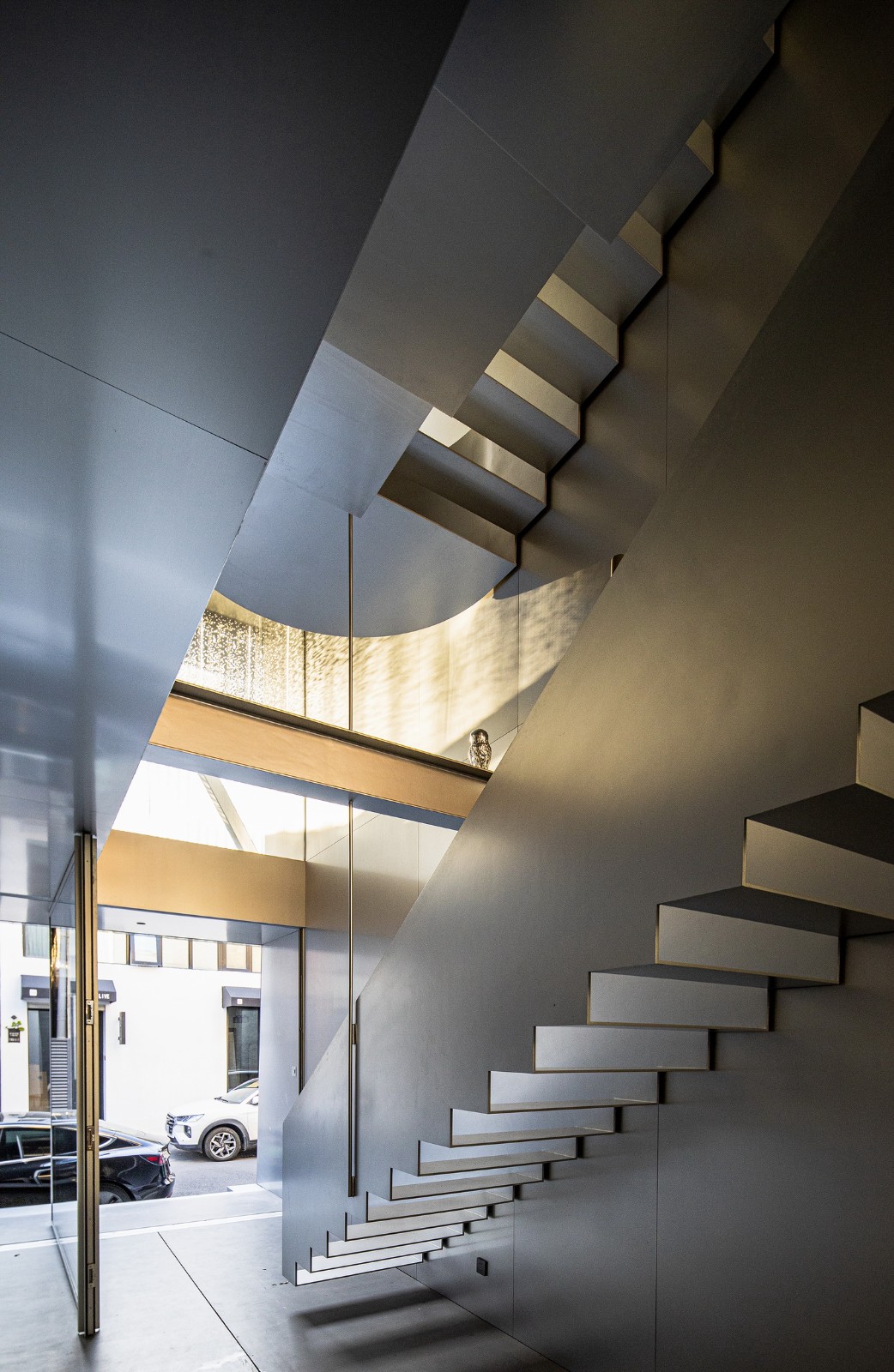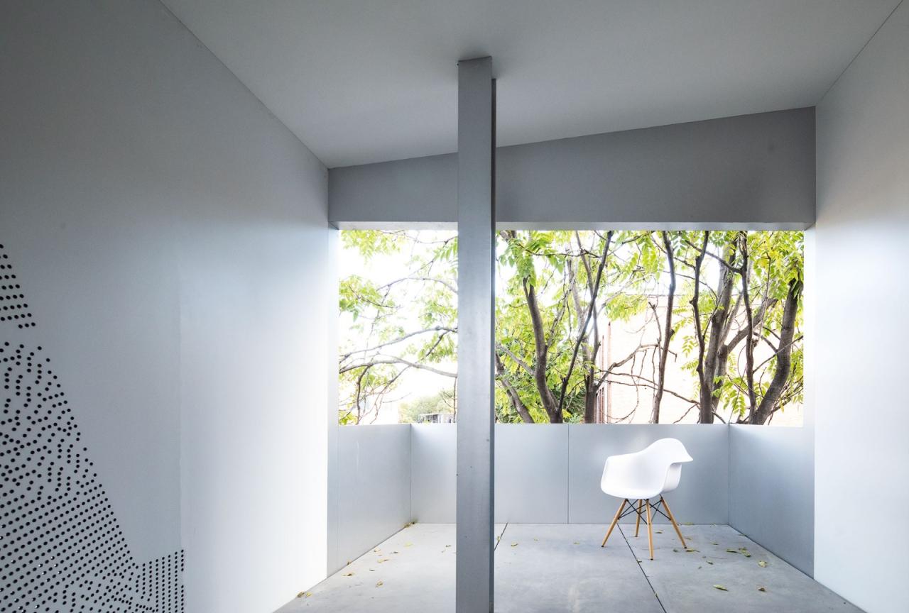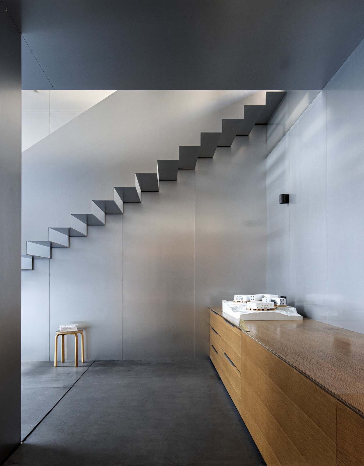 随着楼层向上,空间逐级缩小,高度直至屋顶,向西的侧窗也随之从地面上升到屋顶,被外层冲孔铝板过滤的下午阳光可以柔和地洒满整个空间。