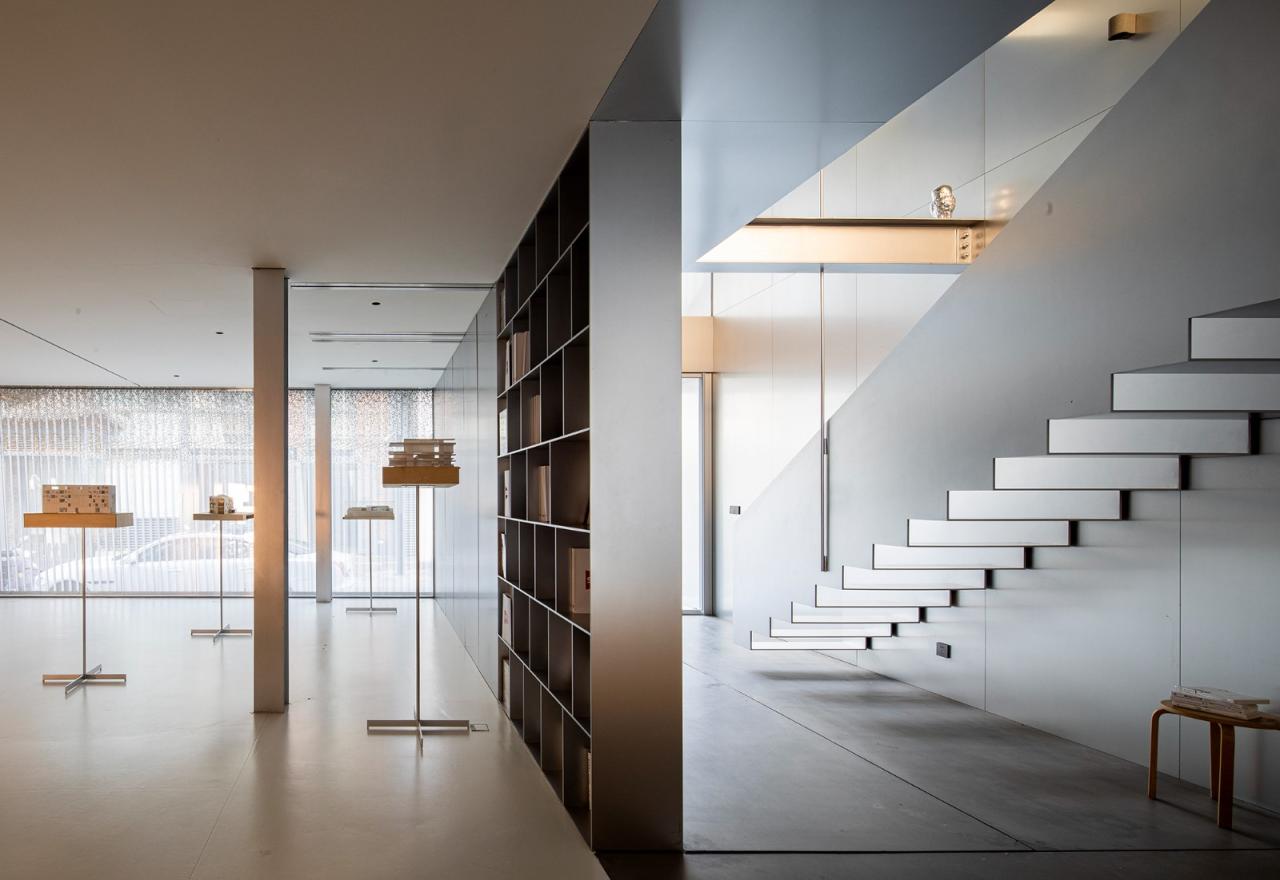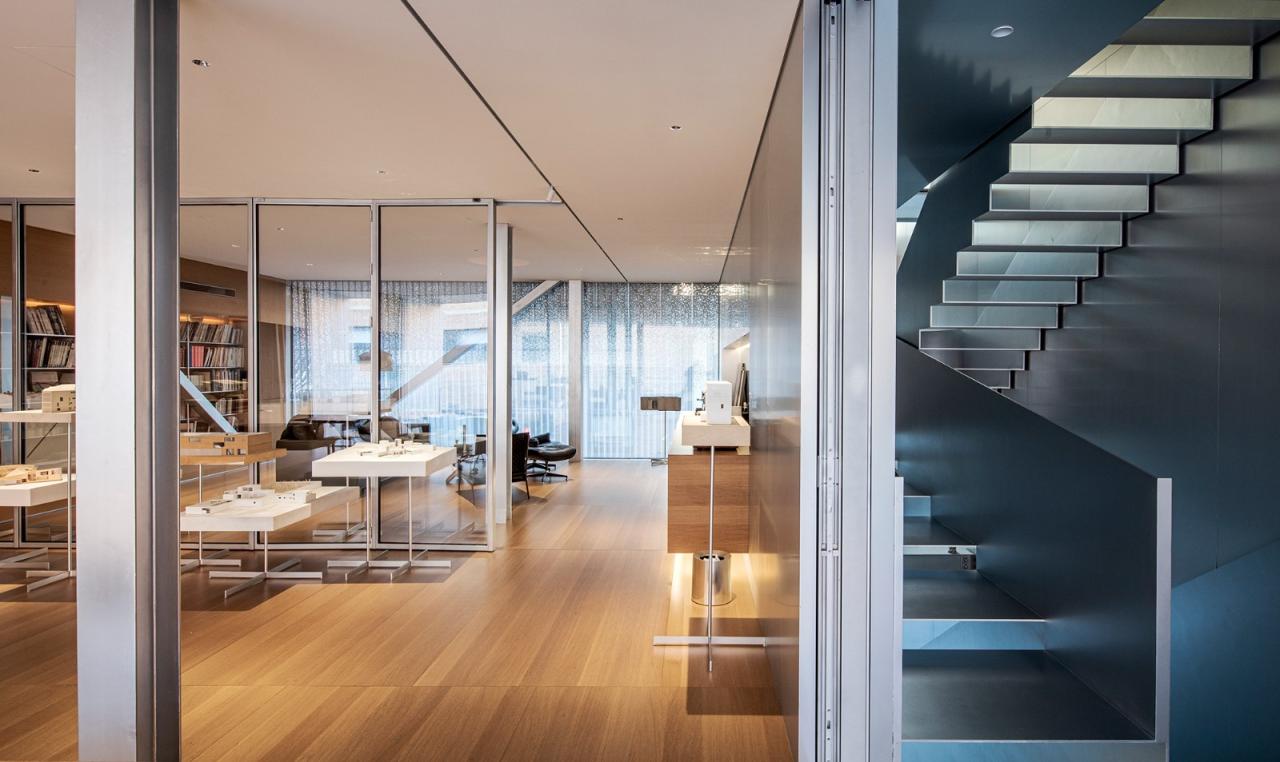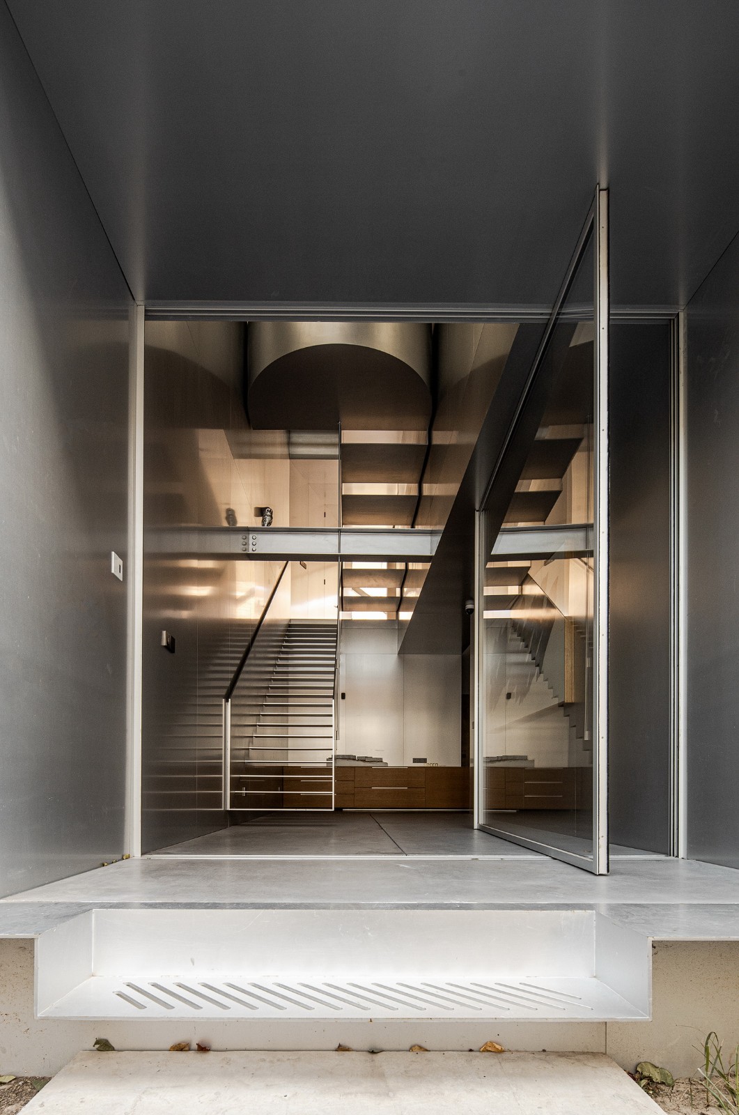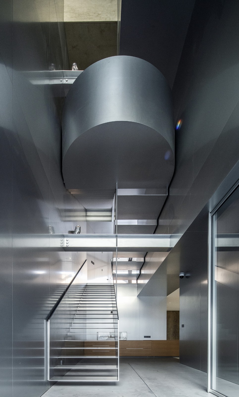 为了将三个楼层更好的地联系成一个整体,一部分楼板被取掉,形成了垂直向上连贯性,这里既是楼梯间,也是一层入口处的开放前厅。