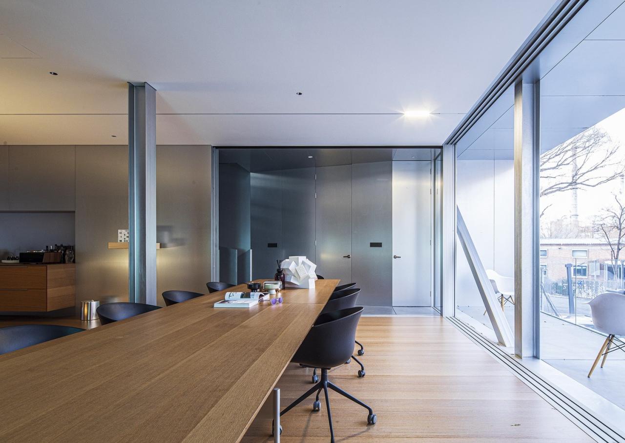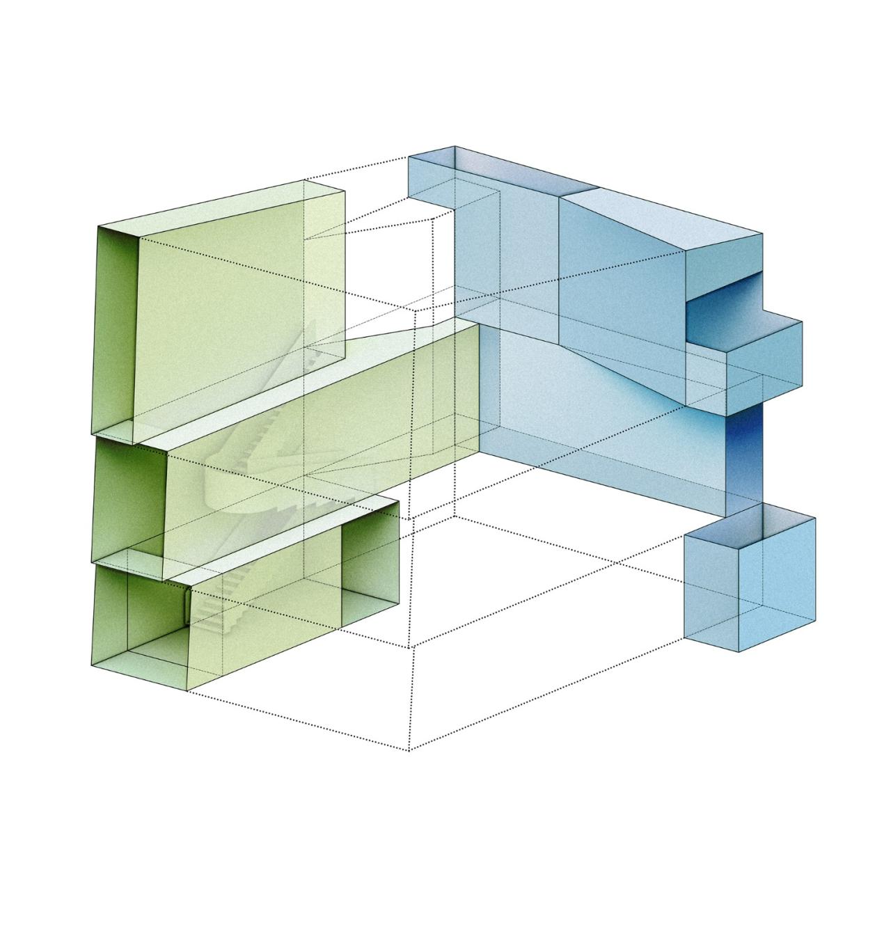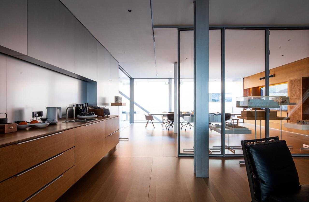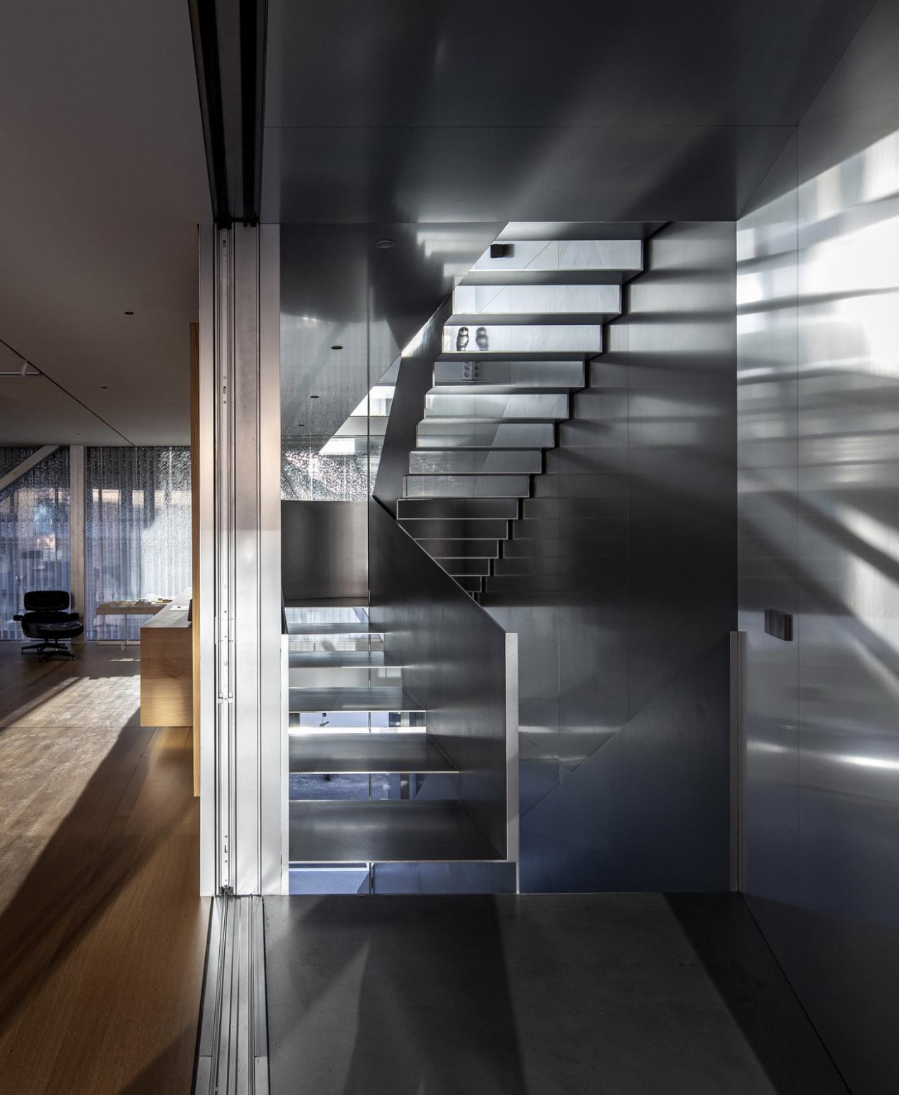 为了将三个楼层更好的地联系成一个整体,一部分楼板被取掉,形成了垂直向上连贯性,这里既是楼梯间,也是一层入口处的开放前厅。