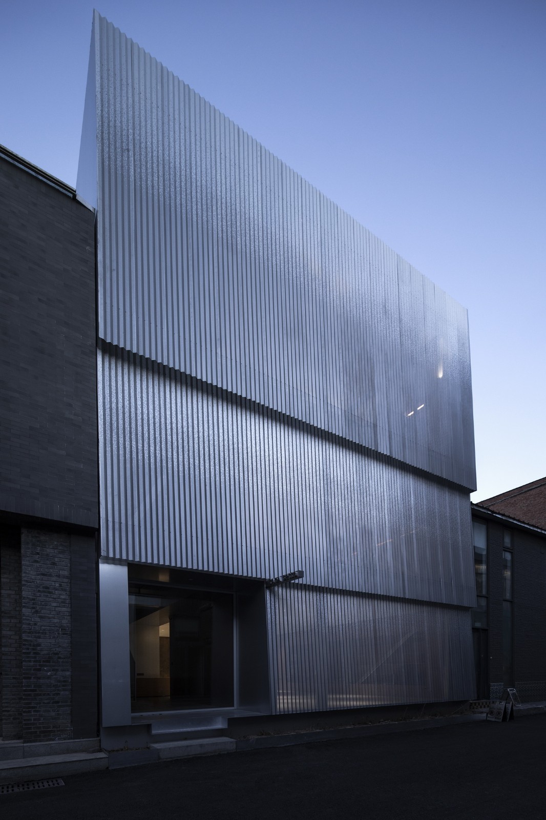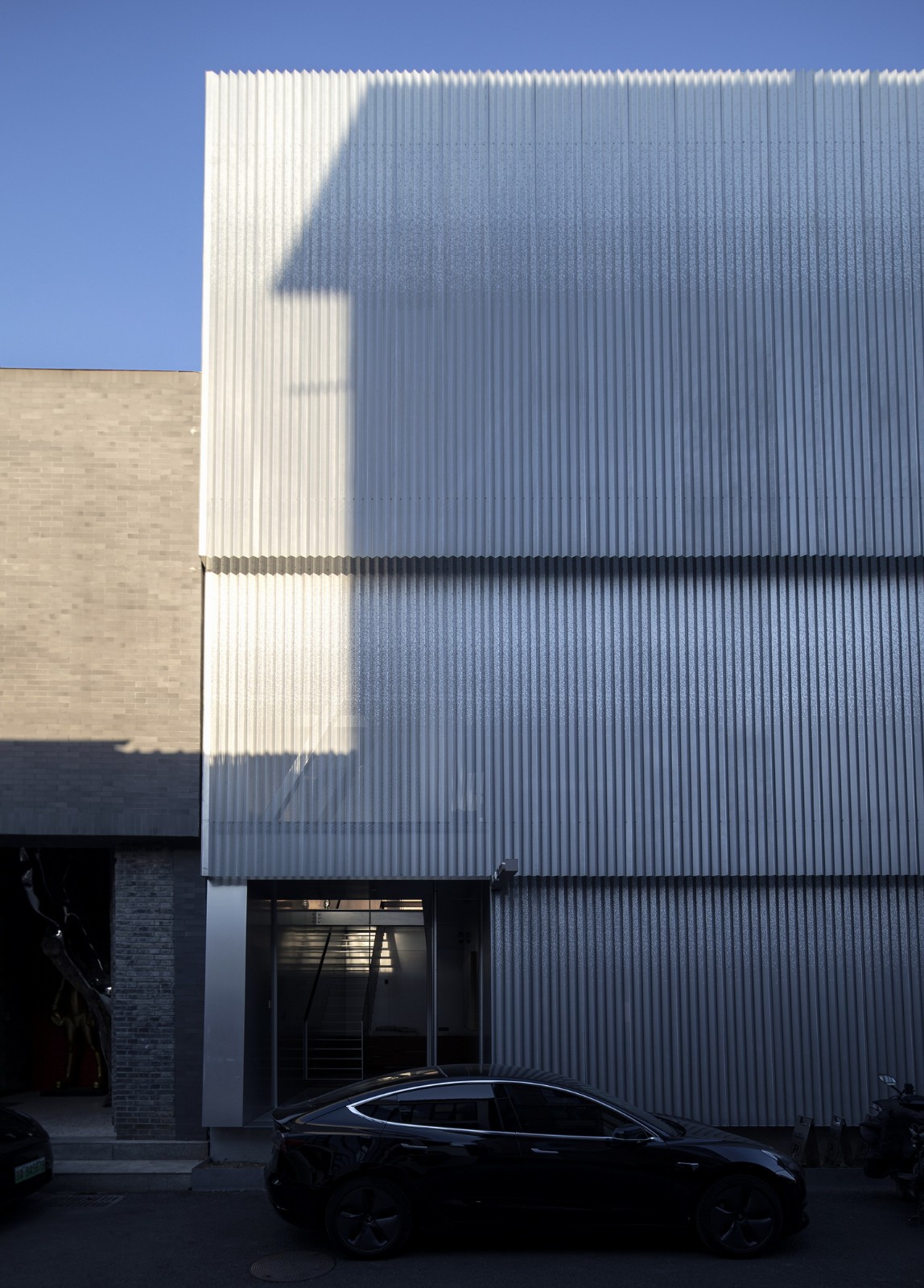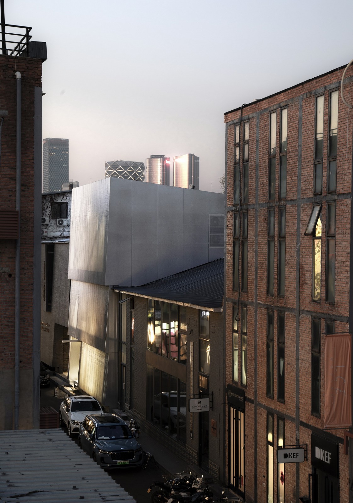 建筑外墙被阳极氧化铝板所包裹,设计团队选择了柔和的反光材料。为了避免过多的日晒,同时也避免与对面建筑的对视,整个西侧的铝板进行了冲孔,使得简洁的建筑形体具有半透明性,被嵌入到周围参差不齐的砖墙建筑形成的环境当中。设计师希望建筑明朗而清新,和周围形成特殊的对话关系,也希望能给这个老旧的街区带来新鲜的活力。