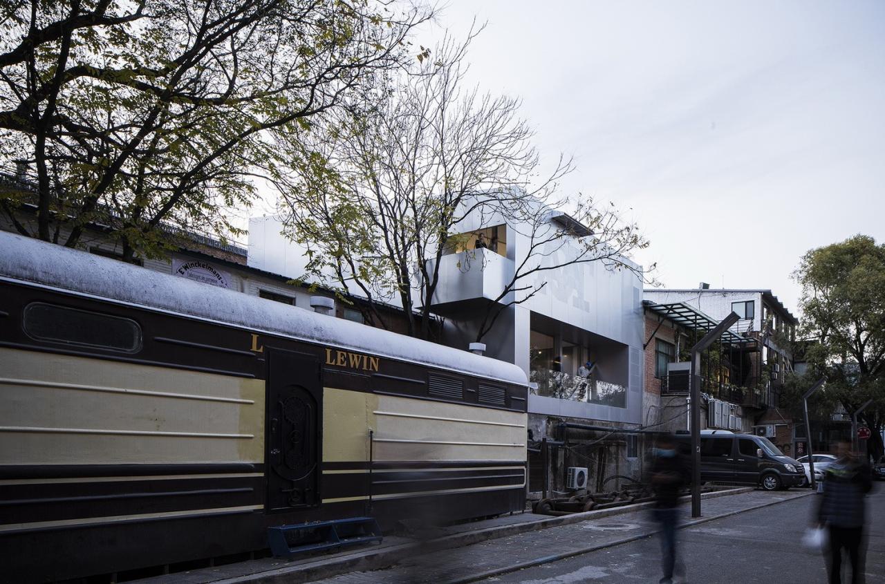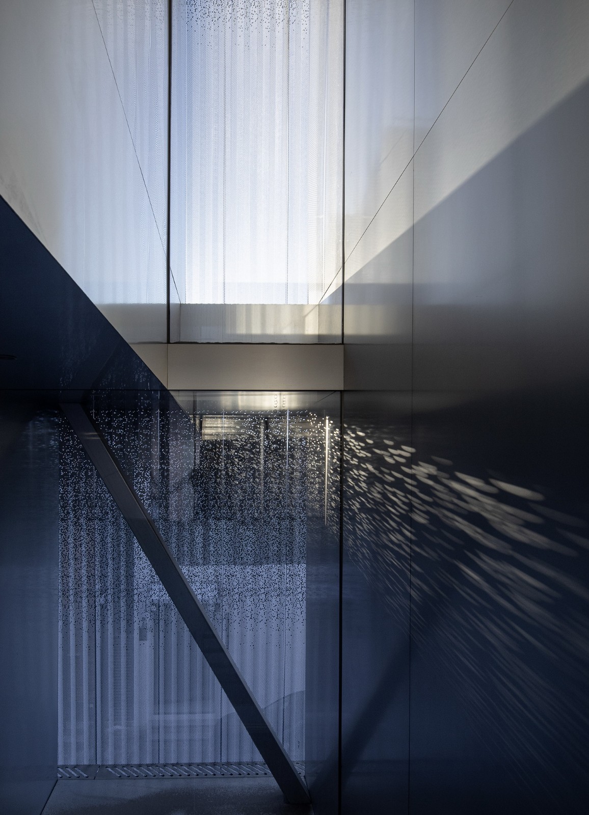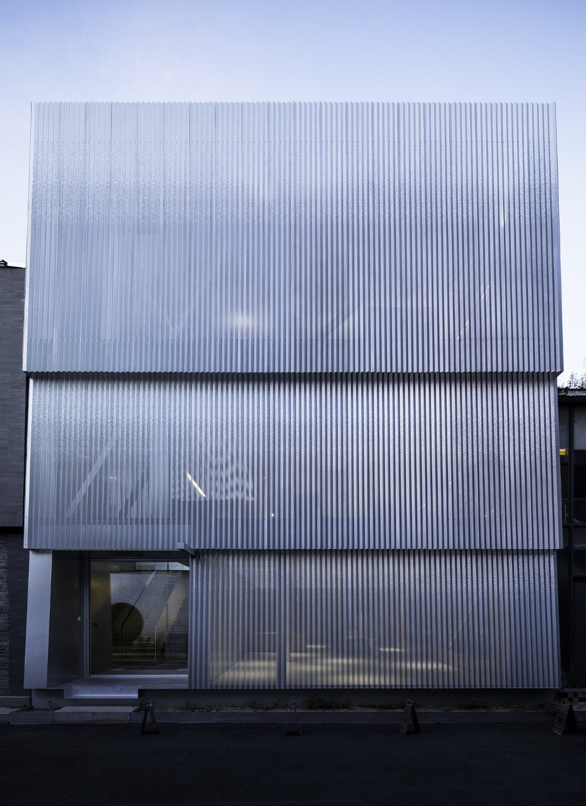 建筑外墙被阳极氧化铝板所包裹,设计团队选择了柔和的反光材料。为了避免过多的日晒,同时也避免与对面建筑的对视,整个西侧的铝板进行了冲孔,使得简洁的建筑形体具有半透明性,被嵌入到周围参差不齐的砖墙建筑形成的环境当中。设计师希望建筑明朗而清新,和周围形成特殊的对话关系,也希望能给这个老旧的街区带来新鲜的活力。