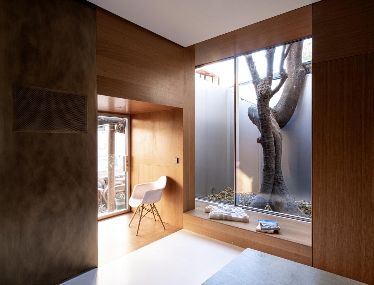 建筑挤在南北两侧建筑的缝隙中,只能选择朝向东西开放,一楼东墙作为798区域的边界院墙必须保留。设计方希望在这个拥挤的建筑物之间,仍然留有接触户外接触自然的机会,将拆除中意外发现的建筑夹缝中狭小的空地扩展作为一楼的小院,这里恰好有一棵大树,成为了室内的风景。