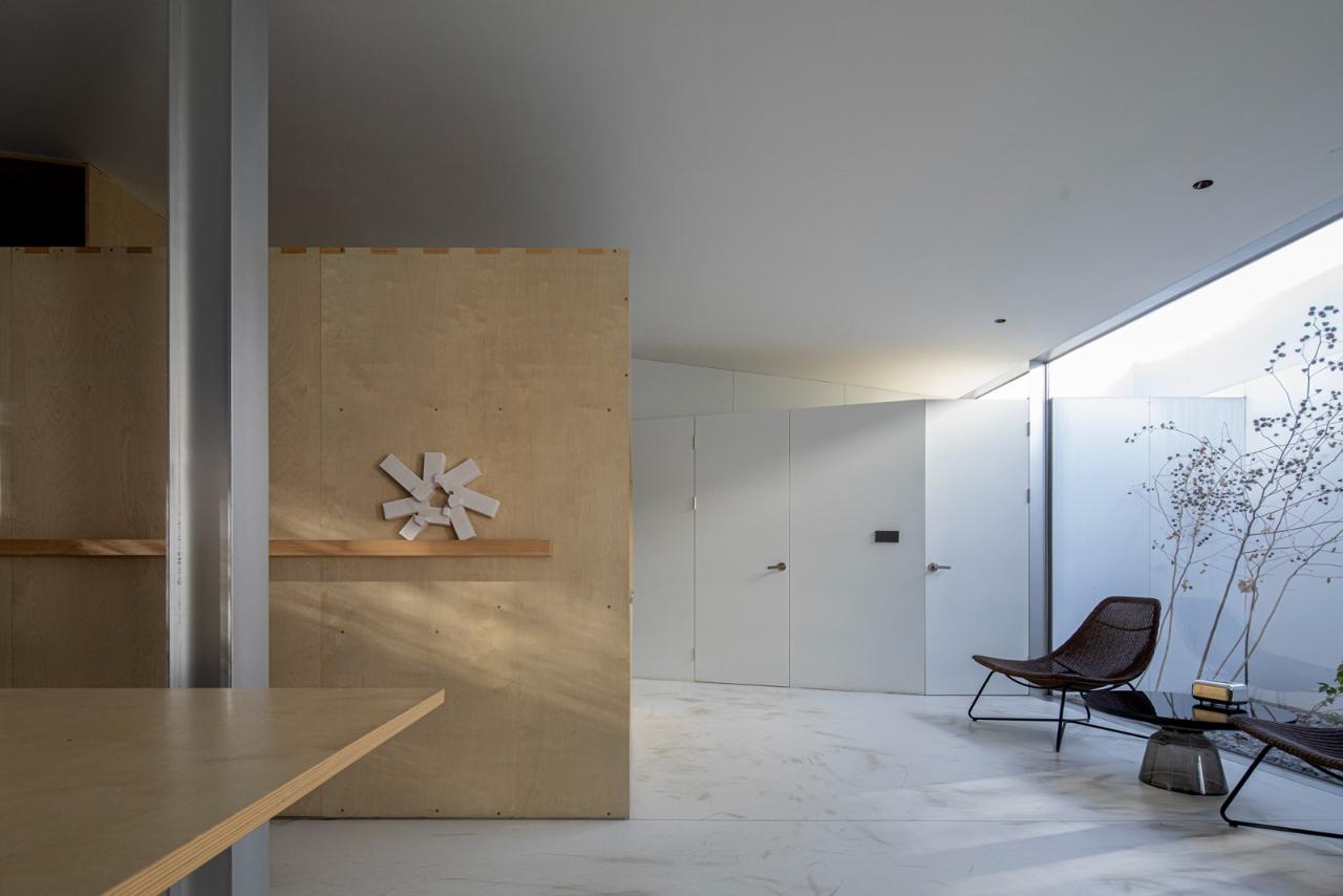 三楼也因此做了一个挑出的阳台,以便工作的闲暇可以在树下小坐。这次的改建使二楼东墙被彻底打开,并朝向东面设置了半户外露台,从一楼沿着楼梯上升,眼前空间突然开放,这种先抑后扬的空间转换,人的精神容易为之清澈明朗。