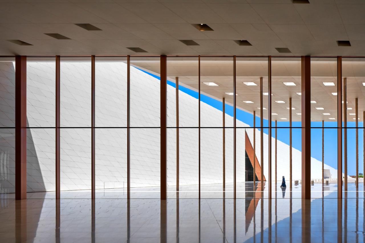 建筑的规模令人震撼。它包括画廊、图书馆知识中心、礼堂、工作场所、驻场艺术家住所和工作室、保护车间、咖啡馆以及社交和研究空间。仅永久展览空间就达 9000 平方米,部分画廊高度超过 20 米。设计团队通过规模宏大的装置和展示,彰显了阿曼丰富的历史,创造了沉浸式游客体验。