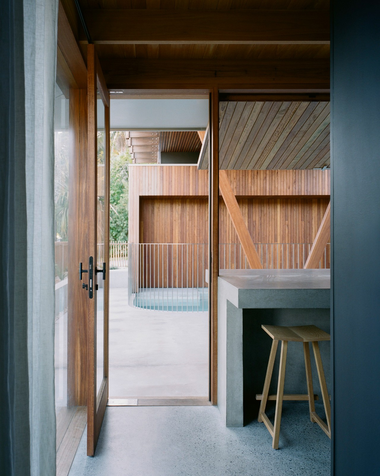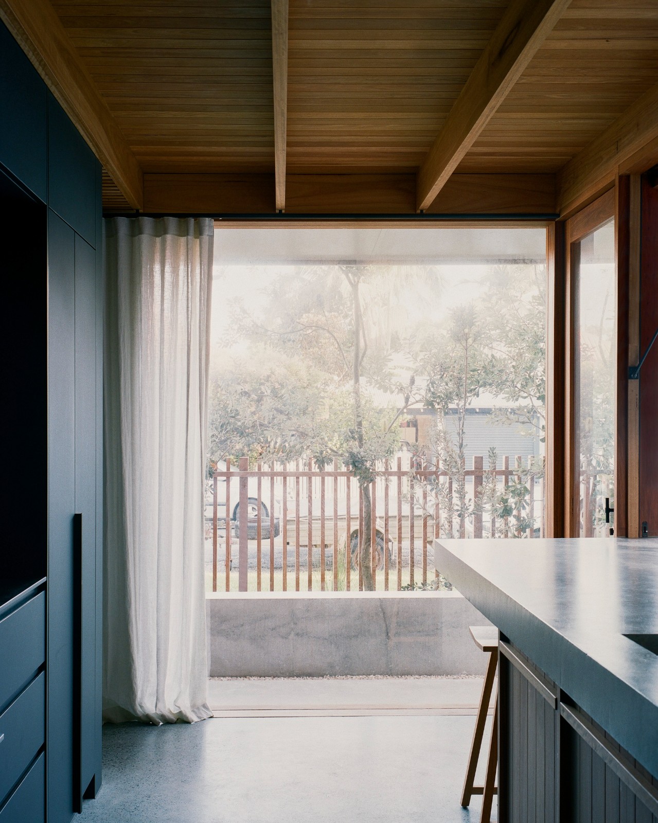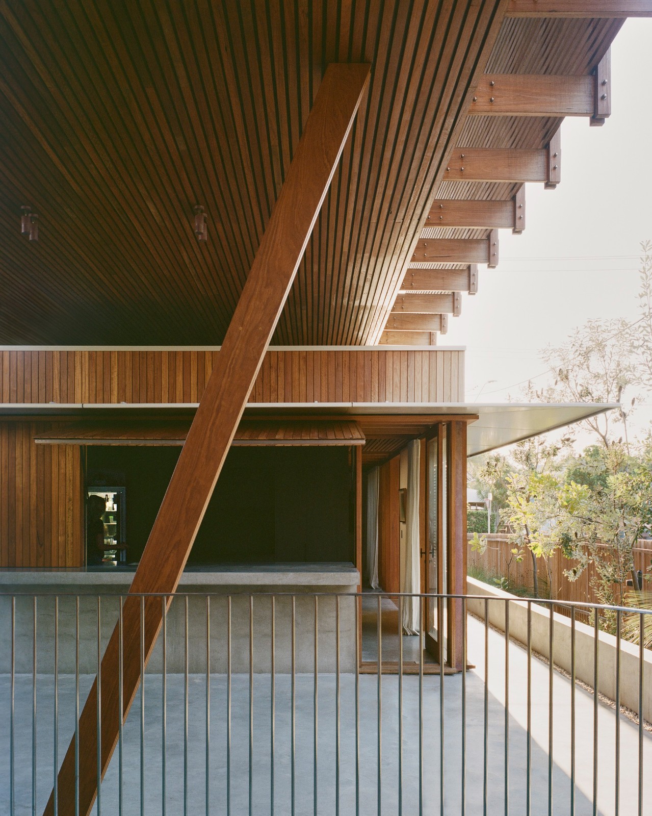 多层次的木质屏风元素不仅为居住者提供了街道一侧的隐私保护,还塑造出流动的空间体验,使斑驳的光影穿透整个居所,突显时间的流逝。这些装置精心构筑的视角,使向外观望成为一种诗意的体验,从不同的视点可见到场地、花园及街道的多重景象,每一处都呈现出独特的框景效果。空间的设计激发了人们的好奇心,增强了居住者对周围环境的感知和敏锐度。