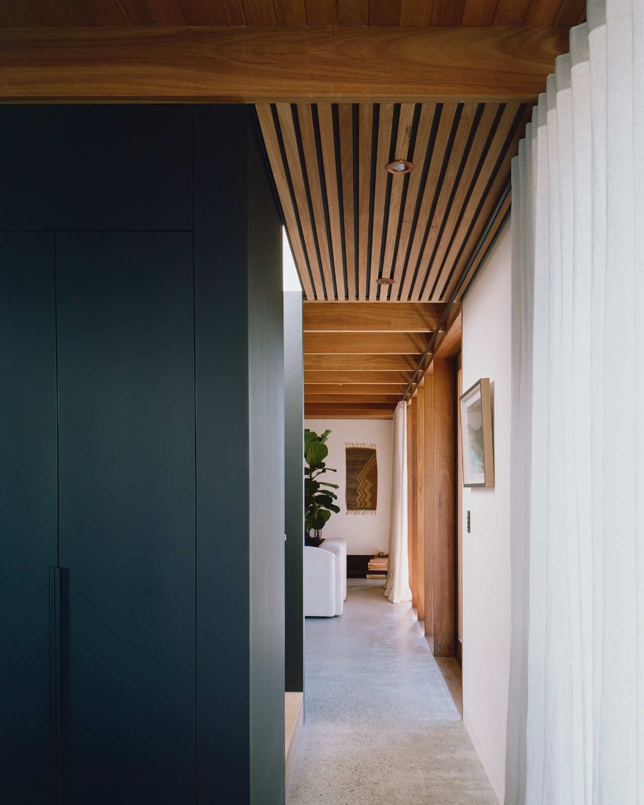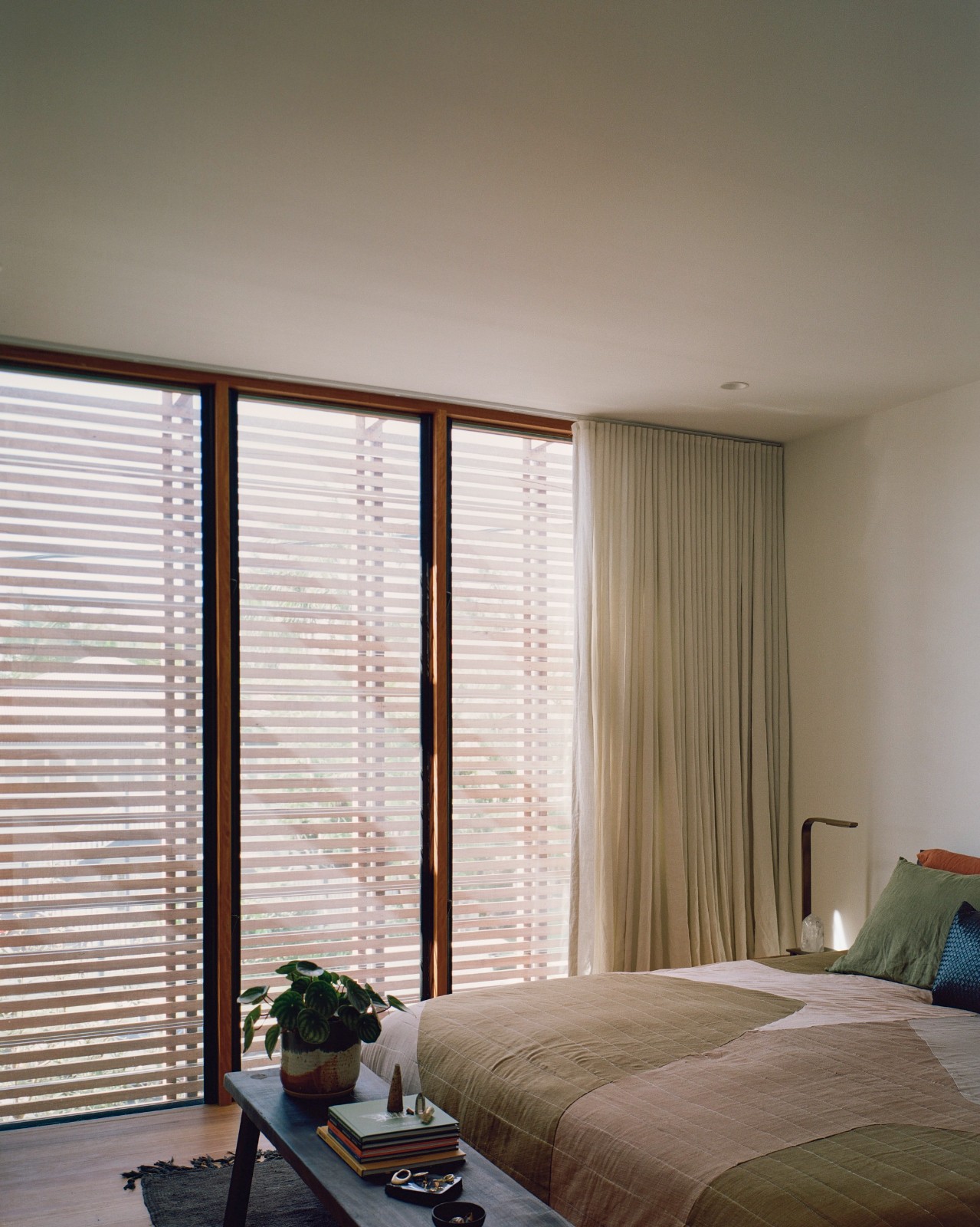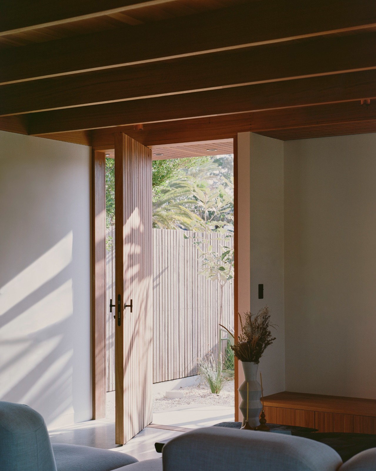 多层次的木质屏风元素不仅为居住者提供了街道一侧的隐私保护,还塑造出流动的空间体验,使斑驳的光影穿透整个居所,突显时间的流逝。这些装置精心构筑的视角,使向外观望成为一种诗意的体验,从不同的视点可见到场地、花园及街道的多重景象,每一处都呈现出独特的框景效果。空间的设计激发了人们的好奇心,增强了居住者对周围环境的感知和敏锐度。
