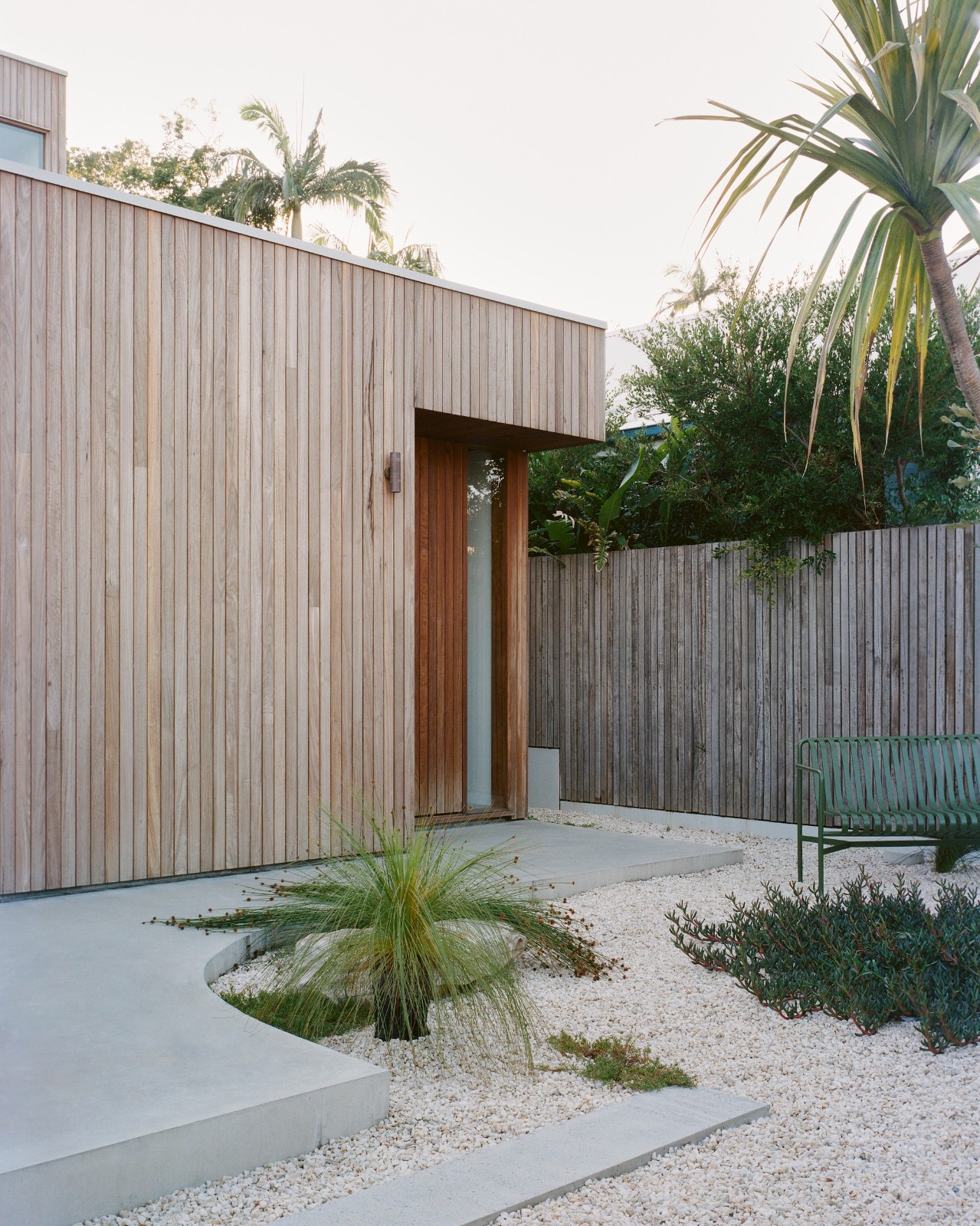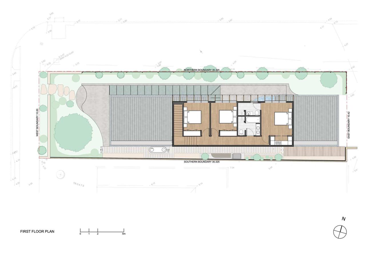 位于拜伦湾一个狭窄的360平方米角落地块上,班加洛路住宅巧妙地应对场地限制,打造了一个高效的小型家庭住宅。面对场地有限的尺寸,设计采用了升高的布局,以满足三卧室住宅的内部面积需求。住宅由三个矩形体量构成,每个体量承担不同的功能需求。
