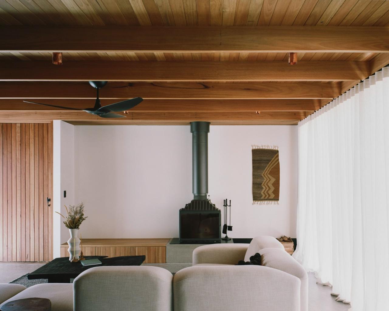 简化的材质选择以本地、可持续获取的天然材料为主,减少了碳足迹,同时赋予住宅一种扎根于场地的归属感。外立面包覆了本地的天然硬木,并延伸至室内。木材在外部随着时间逐渐呈现出独特的银灰色包浆,而在内部则保留了温暖的本色。这种室内外空间的过渡,营造出住宅内部的动态体验,形成一种视觉叙事——一种触感上的“舞动”,在感官上引起共鸣。