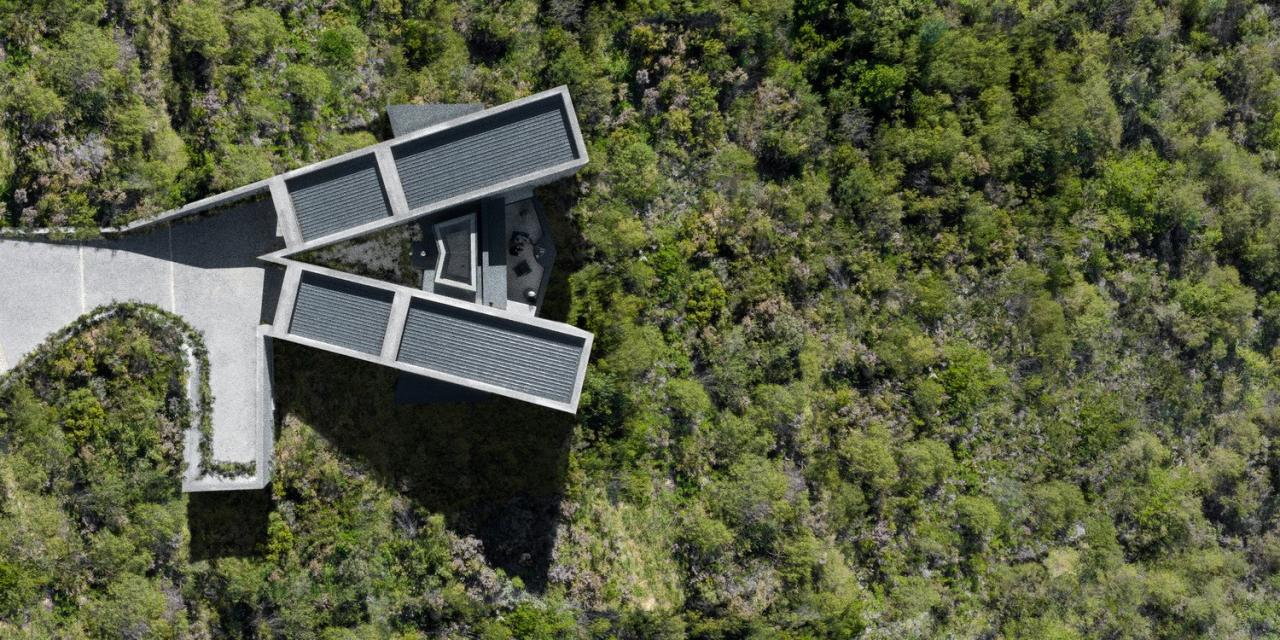 解决方案—— 两个长斜翼以 60 度的角度相互对置。这种配置在两翼之间形成了一个三角形空间,面向视野开放。一座桥连接着这两个翼。这座桥及其与两翼的交汇处构成了住宅的公共生活空间,而两翼则朝向北方布置卧室和浴室,朝向南方布置车库。