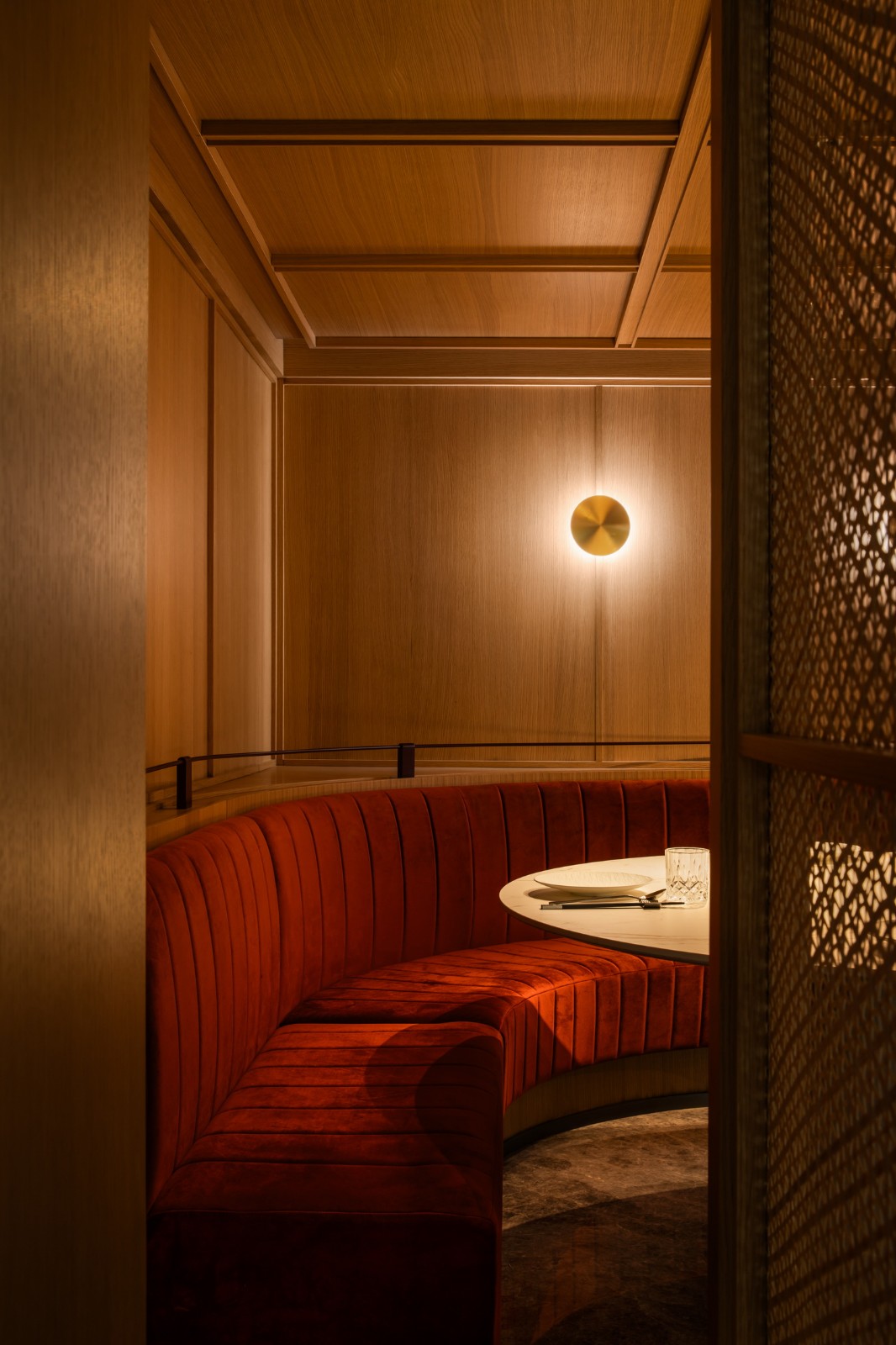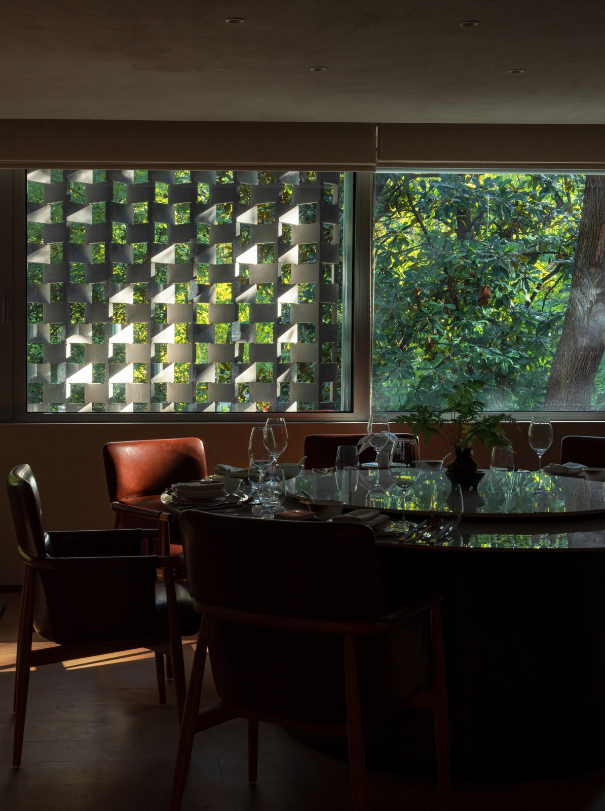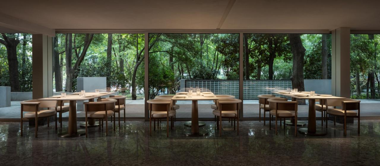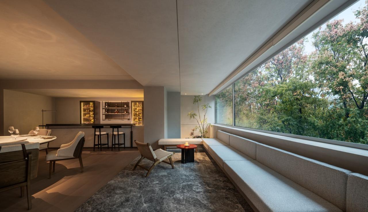 二层以上空间以独立包间为主,设计通过大面积开窗与折叠陶板相结合,创造类似传统花窗的视觉效果。窗外景致随四季变化:夏日绿荫覆盖,冬季红墙隐现。这样的设计延续了传统空间的美学,也为来访者提供了与自然对话的机会。
