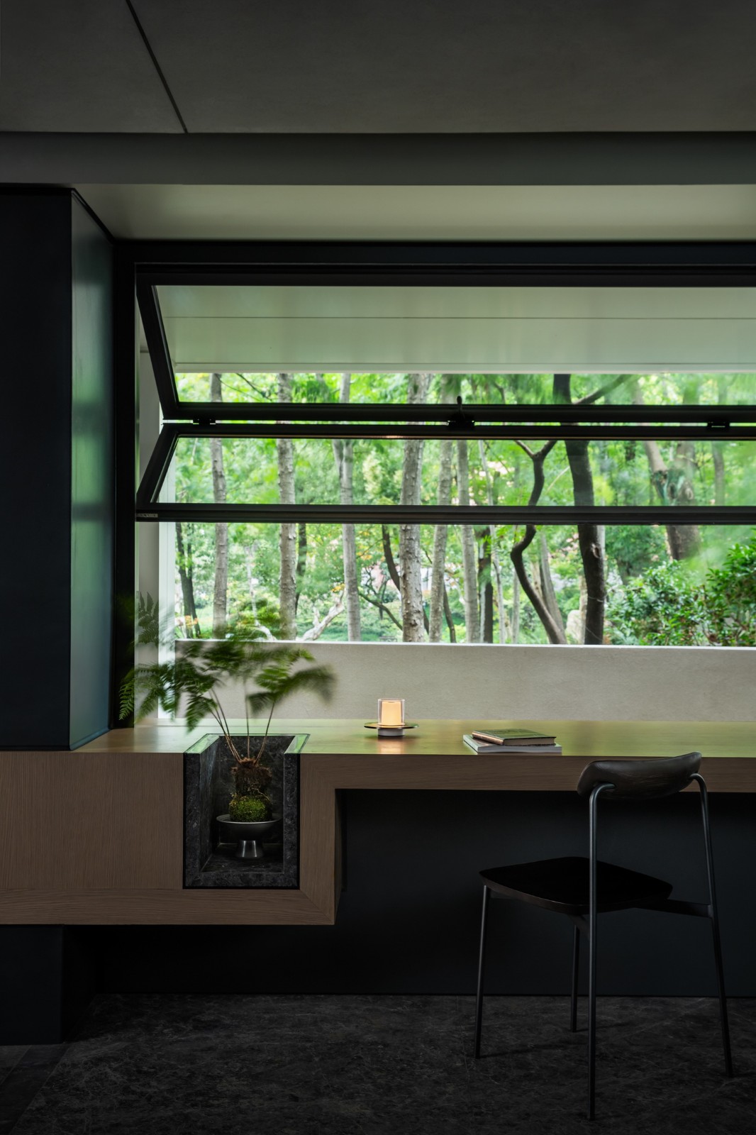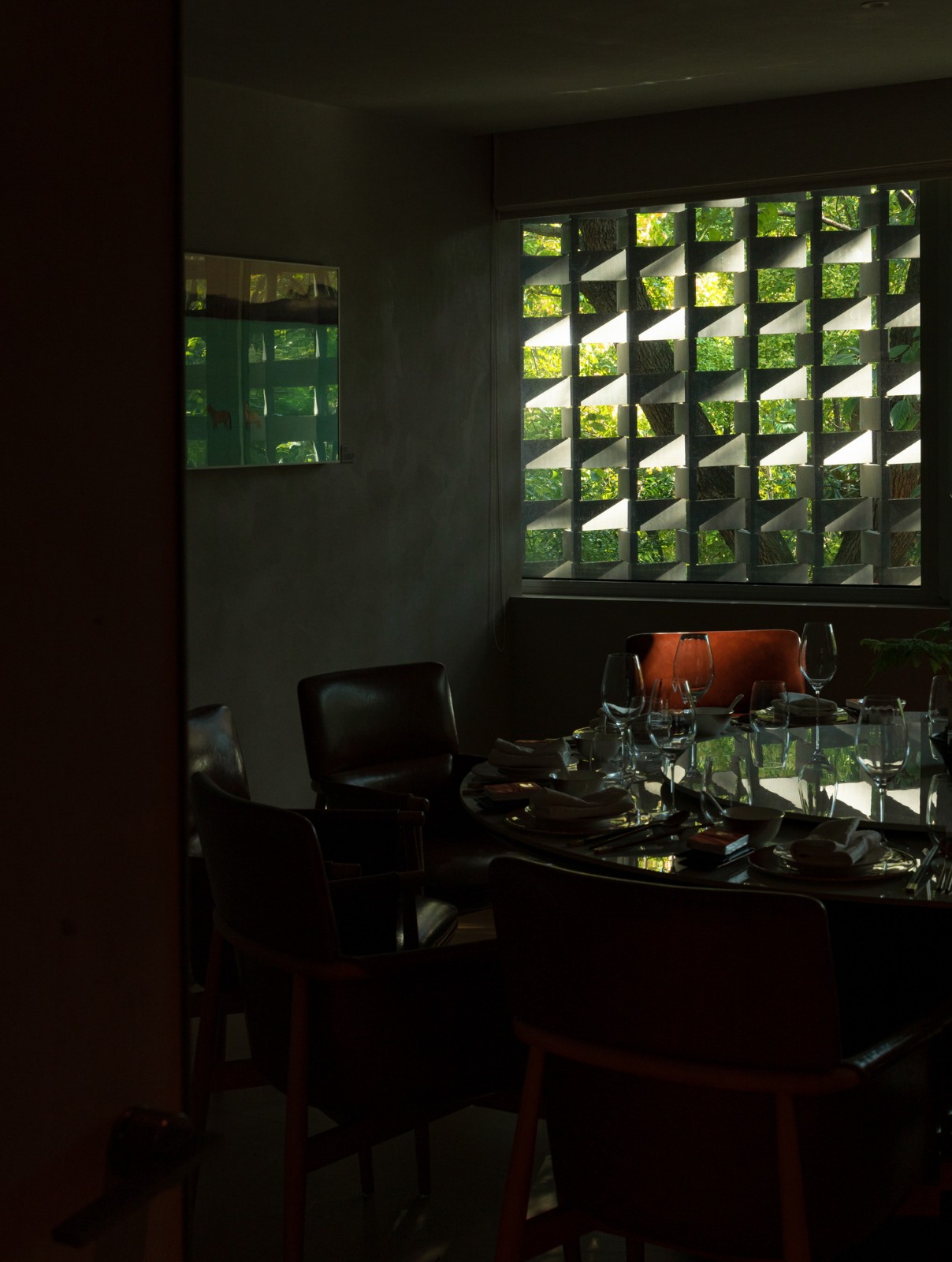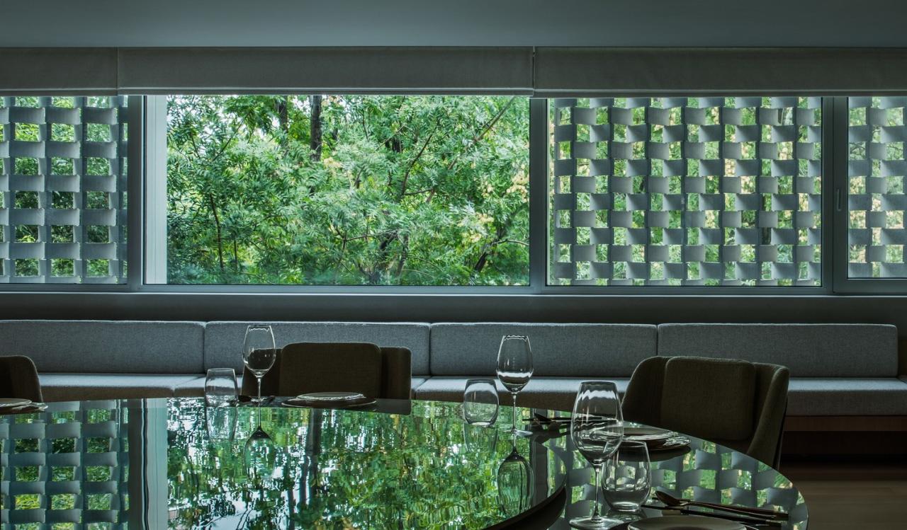 二层以上空间以独立包间为主,设计通过大面积开窗与折叠陶板相结合,创造类似传统花窗的视觉效果。窗外景致随四季变化:夏日绿荫覆盖,冬季红墙隐现。这样的设计延续了传统空间的美学,也为来访者提供了与自然对话的机会。