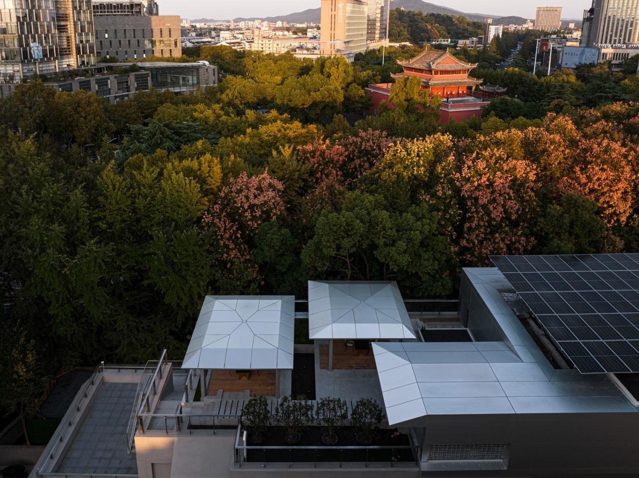 场地独特的自然与城市景观为设计提供了多重叙事的可能性:近处是茂盛的树冠和斑驳的光影,远处则是鼓楼红墙的隐约映衬。设计团队的挑战在于如何回应场地能量,同时弱化建筑、景观与室内的边界。通过“消解”建筑形式,将自然与人文气质引入场地内,模糊传统餐饮空间的界限,营造出一个结合多重体验的复合运营空间。
