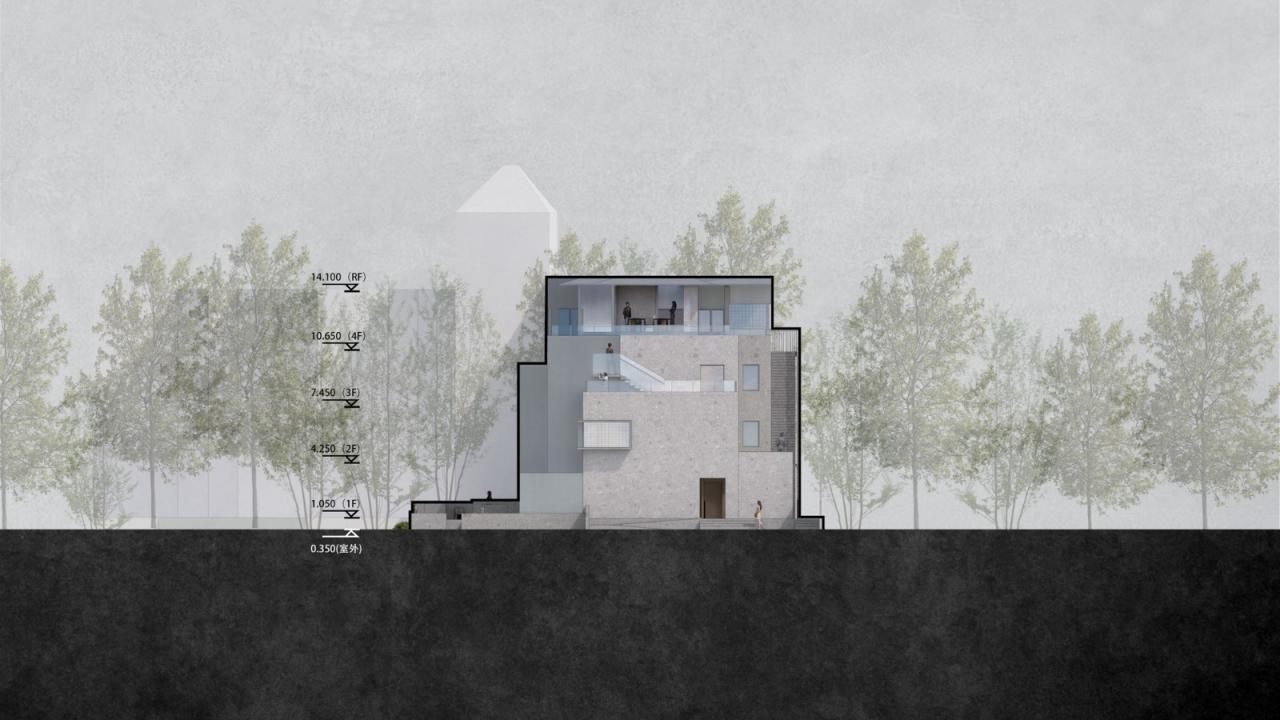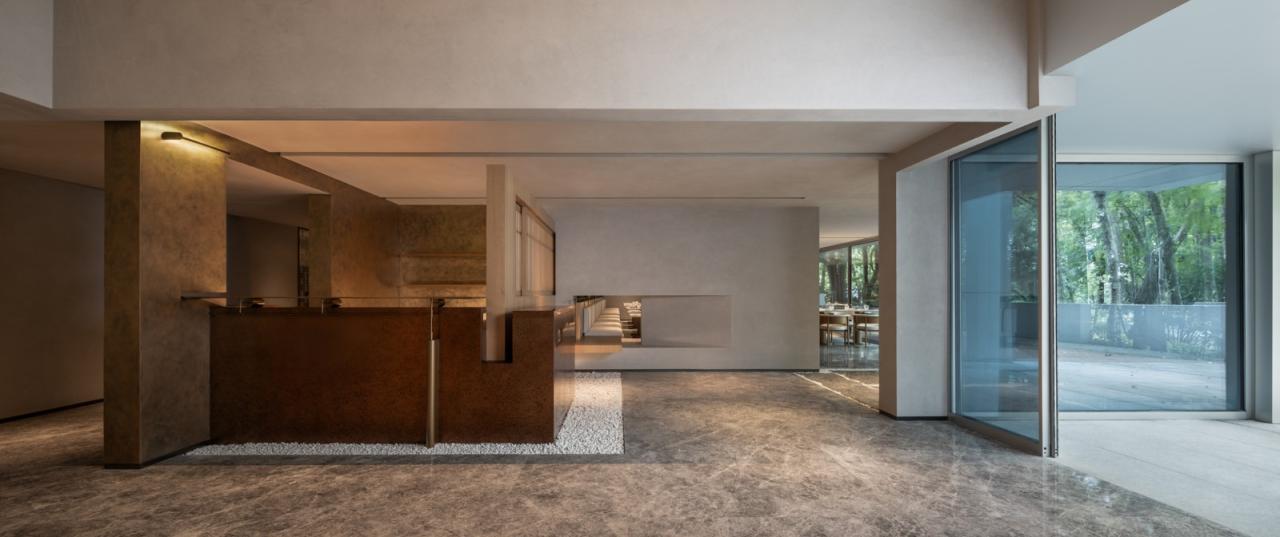 首层采用开放式设计,模糊了室内外的界限,让景观自然渗透进来。片墙作为设计的重要元素,不仅是建筑立面,也是景观的一部分,通过层层递进的形式将外部自然环境引入室内,形成光影与空间的多重叠加。