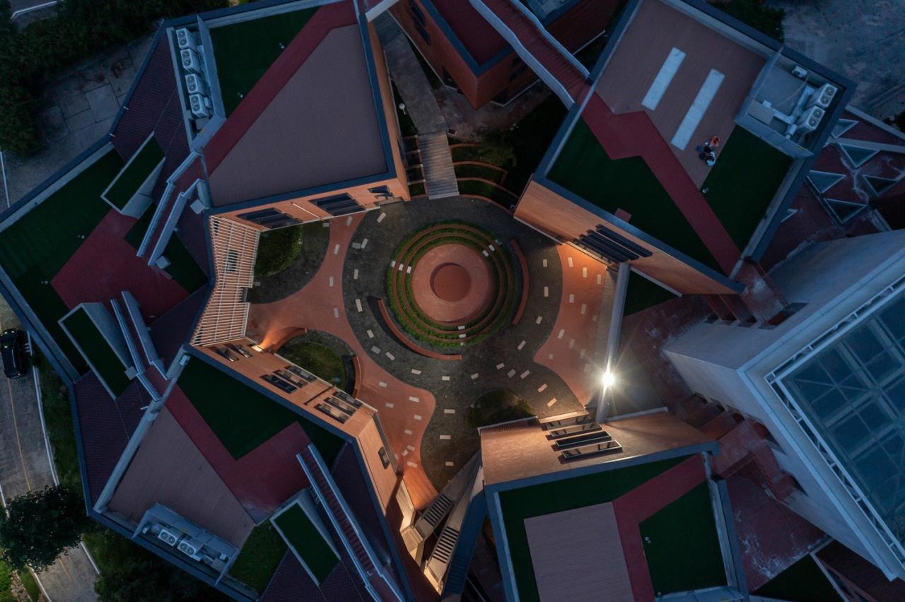 1.“盒中盒”:中央盒子的空间再生与生态改造,打造多功能使用空间中央盒子原为露天空间,内部杂草丛生。改造后,顶部加设玻璃顶盖,将“中央盒子”变为有顶灰空间,通过楼梯的织补将层层楼梯贯穿上下,并在首层加设大台阶,整个楼梯系统既是交通空间也是活动空间。如今,全校师生都可在此处举办活动,诸如歌唱会、时装秀、毕业展等,激发无限可能。2.“园中院”:一方一圆,织补公共游园路径,创造服务整个校园的跨学科交流场所两个院落原先为消极的负空间,景观设计将其整理为“一方一圆”两个院落。方院围绕保留的凤凰木形成红砖座椅;圆院围绕原有下沉地势设置圆形舞台,形成核心空间。织补原有路径,形成多方向入口路径,将师生引入院落,创造整个校园的活力场所。如今,方院和圆院是学校举办各种创意市集、文化演出的场所。3.“看与被看”,丰富的室外连廊和楼梯创造大量的偶遇空间通过室外连廊和楼梯的再梳理,提供交通连接,创造交流机会。丰富的光影变化也使得这些空间成为学生打卡地,以及艺术创作的灵感来源。4. 建筑内部功能整合为适应新的教学模式需求,建筑室内也进行了空间的整合和再设计。位于首层的两个大阶梯教室,被整合为一个完整的展厅空间,内部植入大台阶,形成多功能展厅空问。