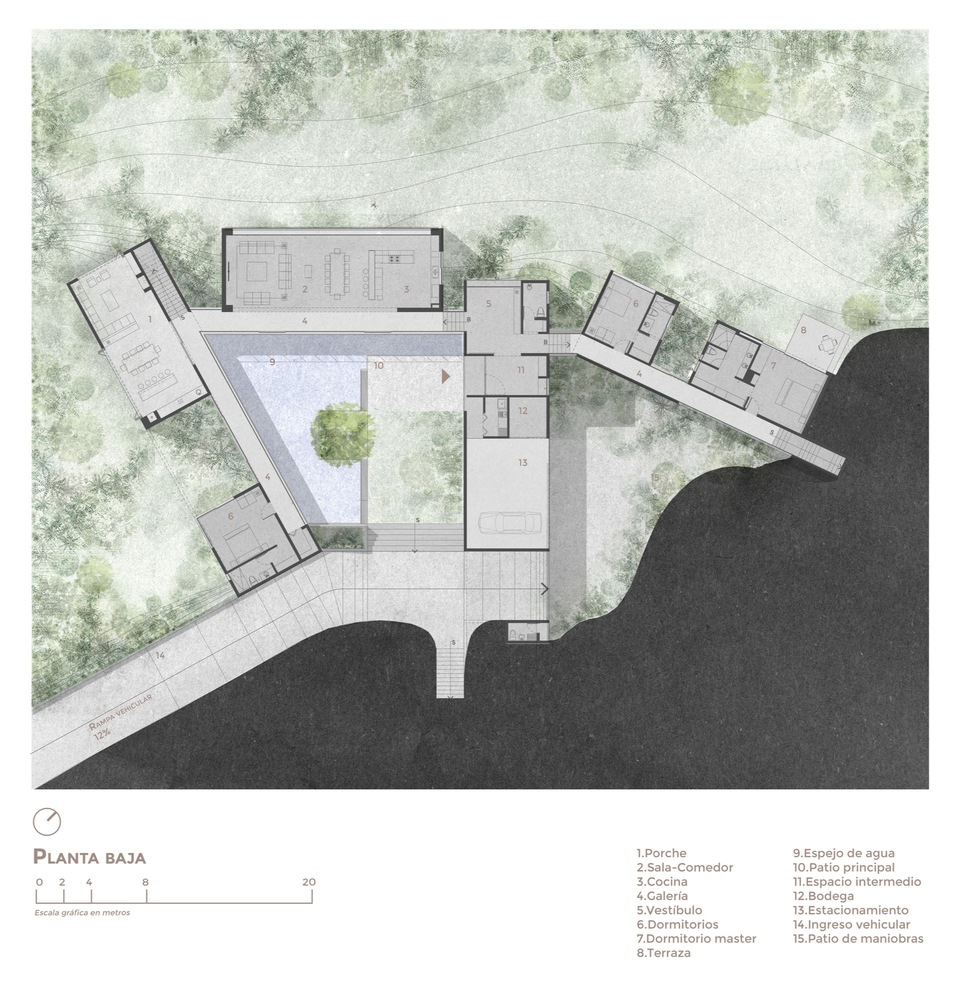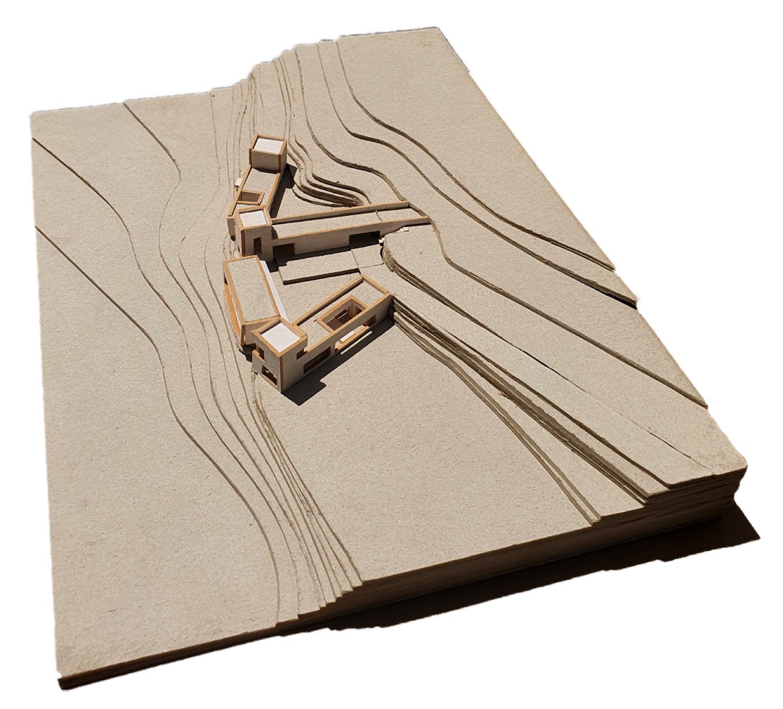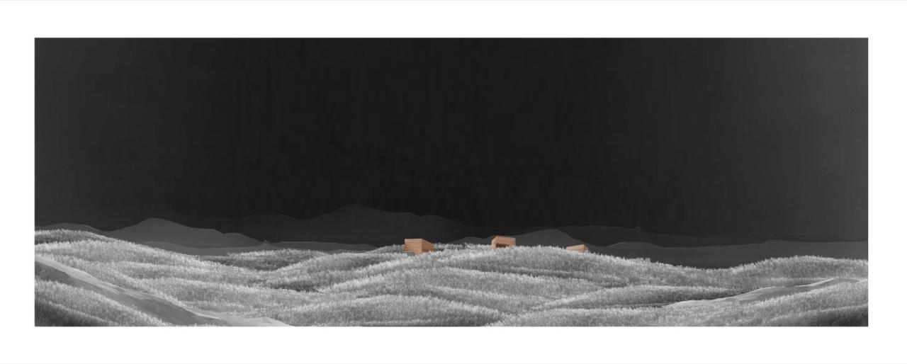 该度假别墅设计通过直观的过程,在物体与景观、人与自然之间建立了联系。在这个美轮美奂、规模宏大的地方,零散的体量可以毫不费力地融入这片土地,保护其自然条件。通过对地形的微妙改造,建筑体下沉并沉降,给人一种从大地中浮现的感觉。或者,它升起并旋转,寻找远处的景色。提案将始终选择在现有景观和预测景观之间进行对话和平衡。