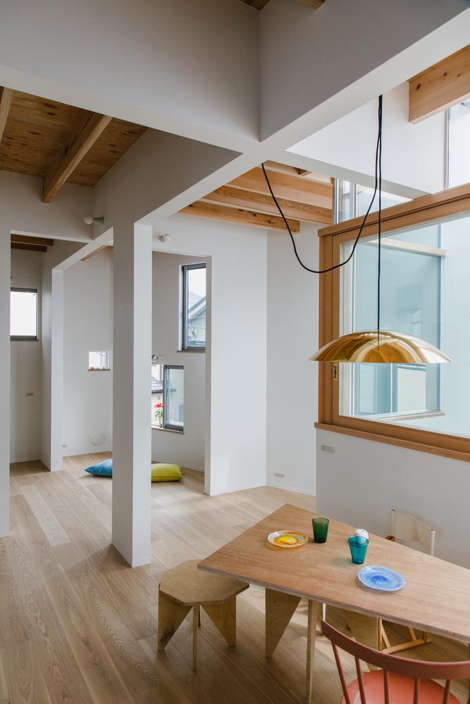 在每个方向上,窗户都是分散布置的,考虑到附近的细微特点,塑造了开口的位置和大小。这样,我们就消除了从外部显示楼层编号和方向的文字感。这样一来,窗户就能在前院有车库的两层建筑和前院有车库的三层建筑之间创造出一种融合的景观。