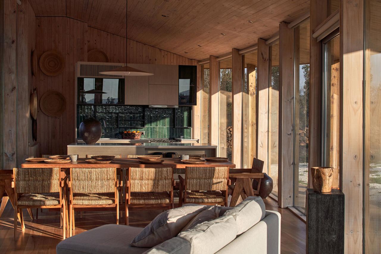 房屋主人的另一个需求是要遵循方位。从控制太阳热量获取和气候效率的层面来看,这并非是最优的解决方案,但对他们而言却是一个至关重要的问题。这个地区在冬季容易遭遇洪水,所以整个房屋体量被抬高至地面以上 40 厘米,这一实用的举措还创造出了一个仿佛悬浮在空中、面向景观敞开的空间。支撑屋顶的柱子直接从地面向上延伸,从外部支撑着露台,强化了这座悬浮亭子的建筑理念。