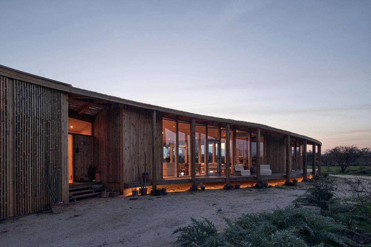 如此一来,当有客人前来拜访时,起居区和卧室能够作为一个连续的私人空间来运用。屋顶掌控着建筑的曲线,从一端到另一端以一条对角屋脊来界定房屋的体量,再加上墙壁和屋顶上方的木质露台,让房屋的体量更为紧凑。室内的墙壁也被设计成了长长的曲线。因此,门变得隐匿无形,从而增强了空间的力量感,这种张力从位于南侧的工作室区域一直延伸至空间另一端的主卧室。