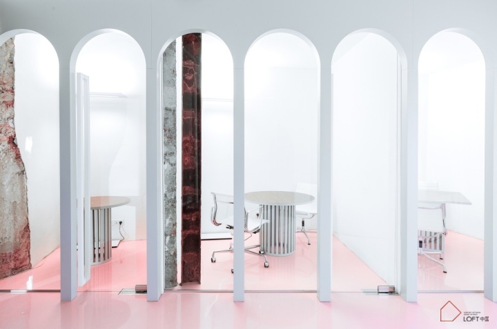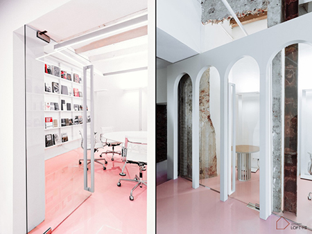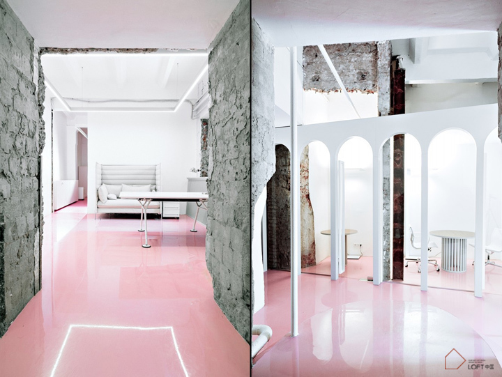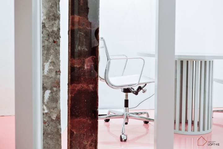 窗台与笼子形状的构件相连,桌子腿也设计成笼子形状。室内全部使用白色粉刷,只有地板使用了醒目的粉色,我们决定保留一些老建筑的原有墙体,这样能带来一种时间的厚重感。尤其将未经粉刷的老墙体与透明材质的玻璃结合使用,使两种来自不同时代的材质在这里相遇融合,能够创造出博物馆一般的历史氛围。