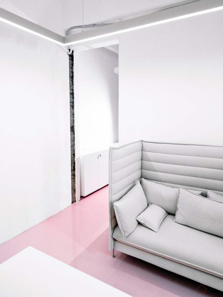 设计中的难点在于如何在严肃的办公室环境中创造出柔和舒适的气氛,比较好的办法是使用亮色的地板以及注重细节上的设计。这间公司里90%的员工都是女性,她们对这里的室内配色方案十分满意。我们是在剧场和韦斯·安德森电影布景中寻找到的设计灵感,整个项目在3个月内就全部完成。