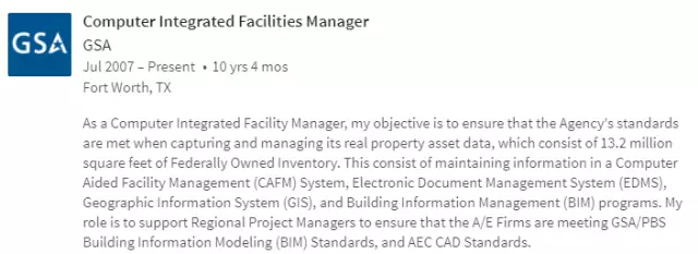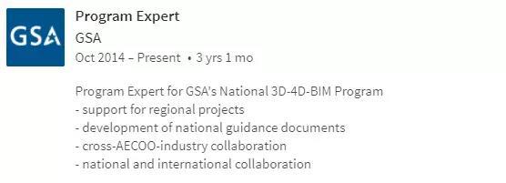 关于岗位晋升,首先“Program Expert”在GSA内部已经是个非常高的级别,因为岗位的前面还有个“全国”的字眼,再往上就是“3D-4D-BIM工作组”的总监了,再再往上就是GSA最最核心分支——PBS(公共建筑服务部)的领导岗位了。所以GSA的BIM岗位算是固化并且职业通道也算是打通了。