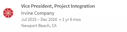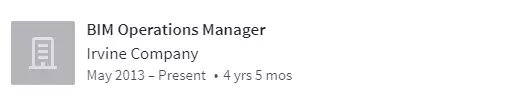 作为业主方,Irvine Company目前主要的BIM岗位以及发展轨迹大致是BIM Operations Specialist/Manager → Director of BIM and Process Integration → Vice President,Project Integration