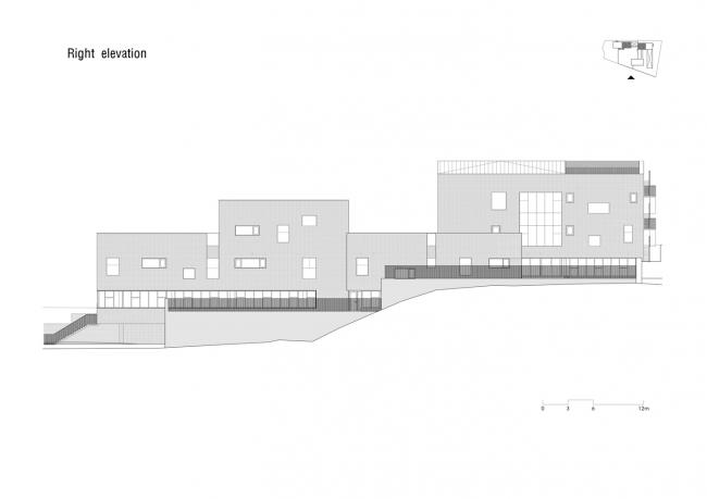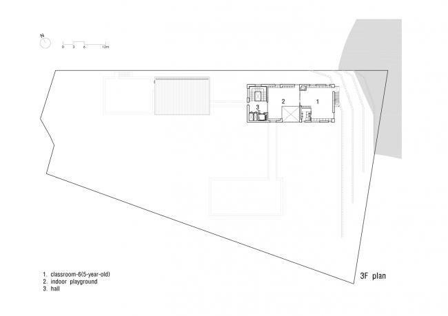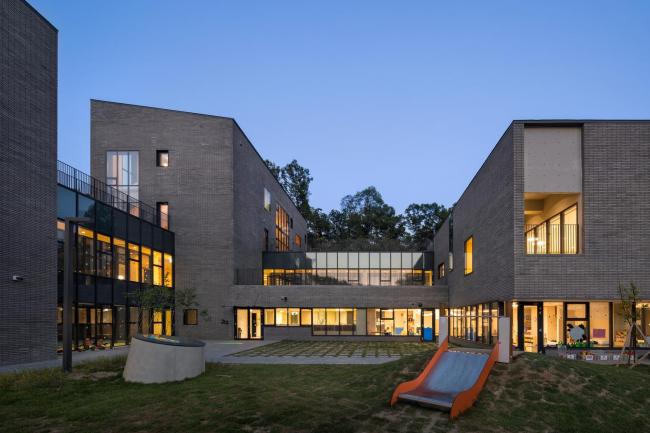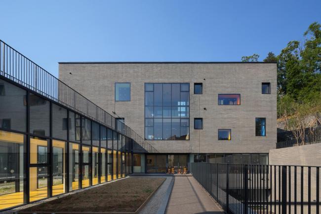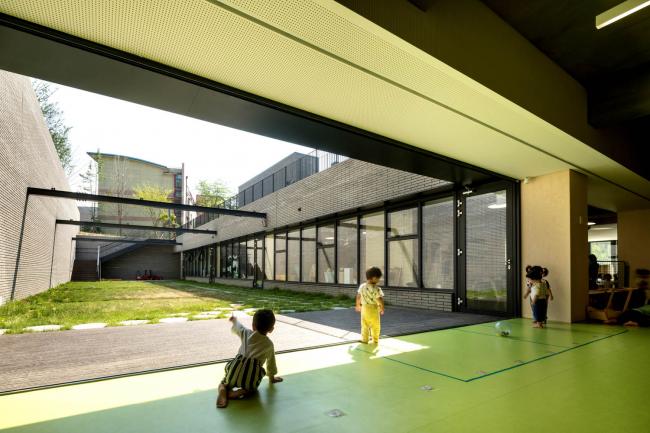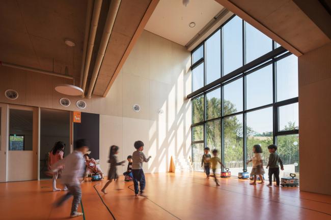 这三座建筑从东到西排列成一排,将游乐场置于中间,让温暖阳光的照入园内。教室之间使用模块化的组件形成休息室和游戏室。随着建筑物的高度随着斜坡逐渐升高,幼儿园自然而然地与周围山景相融合。素色水泥砖和清水混凝土饰面共同成为周围自然环境的背景,与周围的绿色相一致。