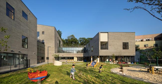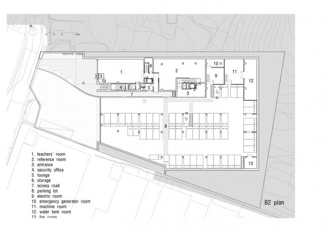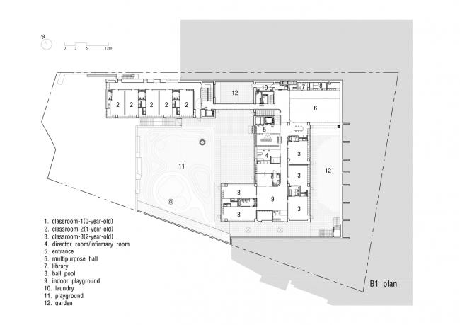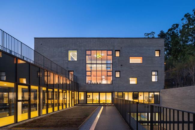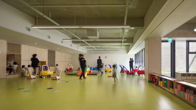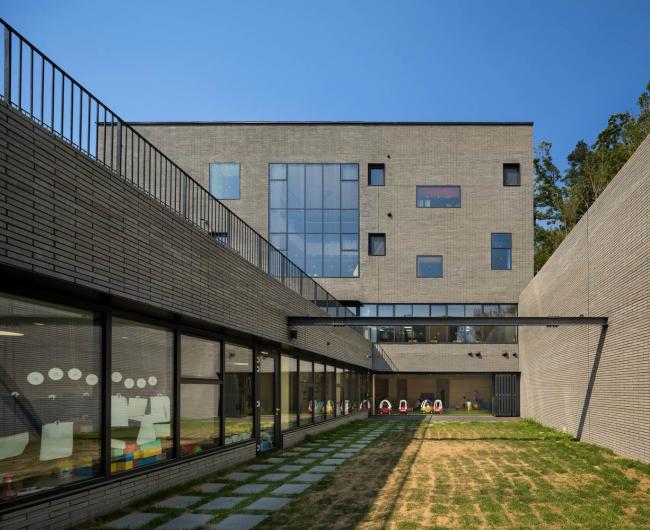 建筑根据自然渐变的场地地形被分成三层:最底层为停车场和后勤服务设施;上面两层为幼儿园功能用房。学校通过对所有停车位和公交车转弯的控制来为孩子们提供安全的生活环境。在规划期间以有效的方式利用斜坡场地可以使地下空间获得与一层内同等条件的自然光照射量。除了顶层之外,所有楼层都与地面直接联系,这意味着几乎每个幼儿园教室都有前院。300名学生被分散在三个不同的建筑单元内,彼此通过地下的台基相连。
