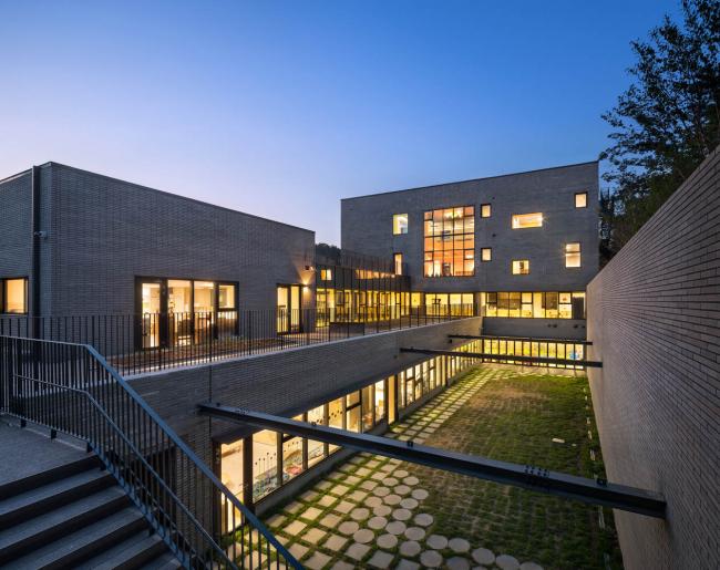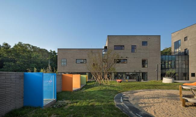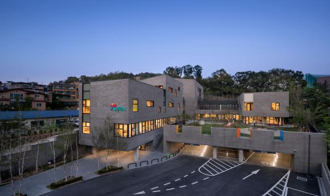 建造在盆唐东部的Naver Imae幼儿园总共有在校学生300人。学校利用一片横跨场地十多米的斜坡建造了与学院同规模的花园,为了达到法规中要求的20%的建筑绿地率,事务所打算采用新型的幼儿园设计方案。