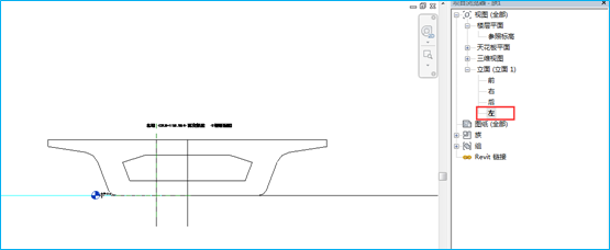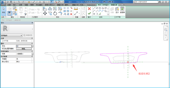 四、切换到左立面视图中,使用移动命令设置两箱梁轮廓相对高差,以实现箱梁纵坡;使用旋转命令,设置箱梁横坡。