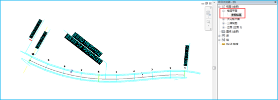 三、切换到参照标高平面视图中,将导入的箱梁横断面图复制到9#墩与10#墩之间的桥梁路线设计线两端,并通过旋转使其与桥梁路线设计线垂直。