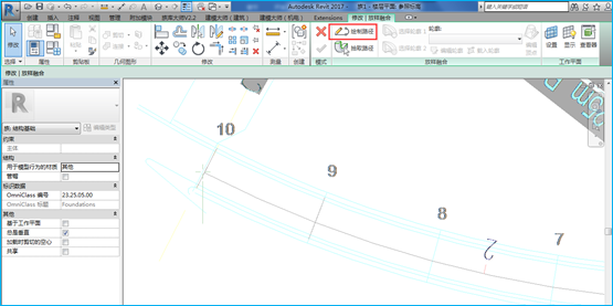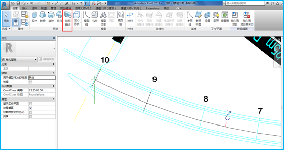 五、切换到参照标高平面视图中,选择放样融合命令,拾取9#与10#墩之间的桥梁路线设计线为绘制路径。