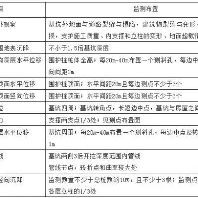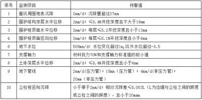 基坑支护工程是一个风险性工程,影响基坑工程安全的不确定因素很多,基坑开挖施工时,应通过监测和现场观察,获得准确数据并及时分析处理,严密注视是否有险情发生及险情发展的动向。对可能发生的突发事件制定必要的应急措施。本项目基坑支护工程的监测项目,报警值和频率要求如下表-1基坑监测项目监测布置表以及表-2基坑监测项目预警值表所示: