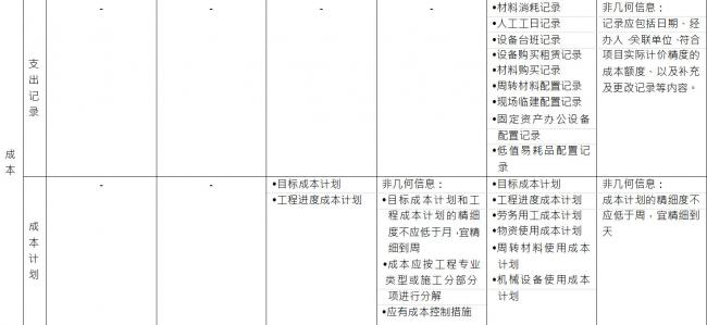 BIM施工模型细度表关于成本中支出记录和成本计划的说明