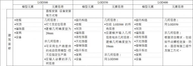 BIM施工模型细度表关于建筑装修的说明