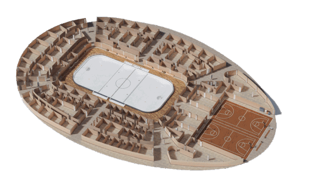 3/4剖面可清晰的展示横纵两个方向的空间布局对大型体育馆而言非常直观