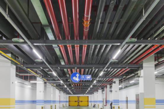 车库管线排布美观,联合支吊架安全可靠,管道居套管中,灯带线槽平直,喷淋布置间距一致,标识清晰。