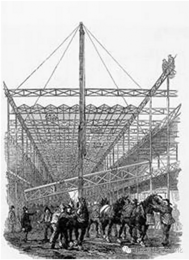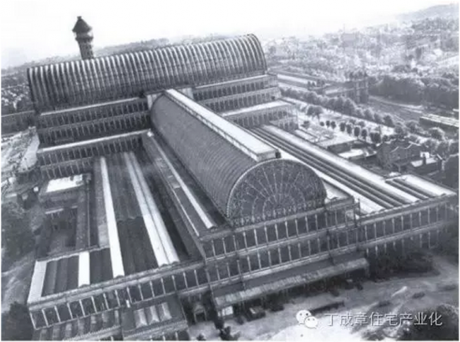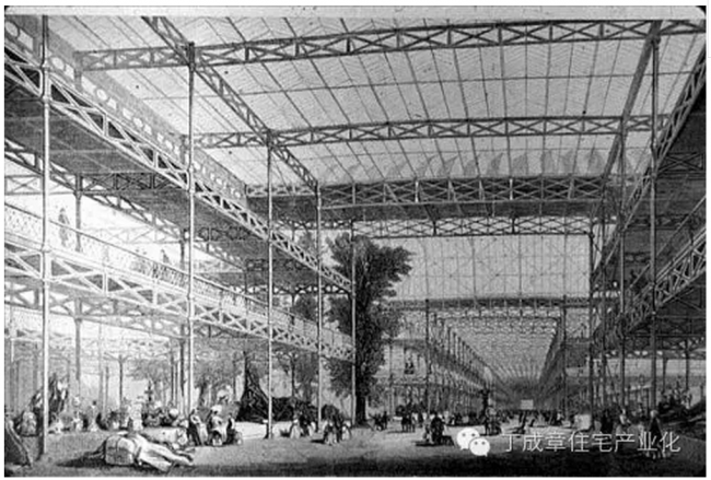 公元1851年,第一次工业革命在英国结出了丰硕成果,大英帝国处于鼎盛时期,英女王邀请世界各国参加大英帝国举办的第一届世界博览会。约瑟夫·帕科斯顿(Joseph Paxton)仰仗现代工业技术提供的经济性、精确性和快速性,第一次完全采用单元部件的连续生产方式,通过装配式结构的手法来建造大型空间,设计和建造了伦敦世界博览会会场水晶宫。