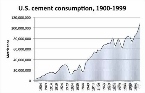 在上图中,我们可以清晰地看到,在大萧条时期、二战和80年代早期的经济衰退时期,美国的水泥消费量出现明显下降。在20世纪的100年间,全美水泥消费量总共为44亿吨。 相比之下,依照伦敦《国际水泥评论》杂志的数据,中国在2011到2013年的短短三年间,就消耗了大约64亿吨的水泥。