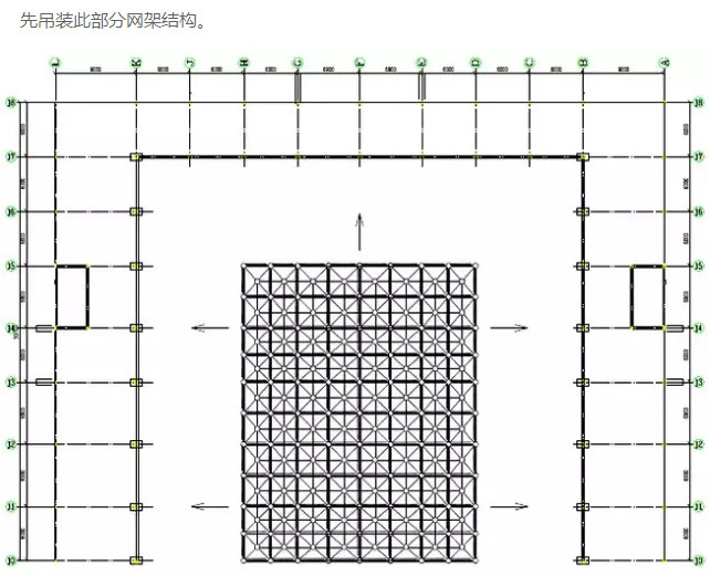 网架结构的安装由中间部分开始,向周圈扩散,三面同时开始安装。此安装方法可以提供多个施工作业面,加快网架的安装进度。
